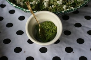 I find pesto often times to be too heavy. I took 3 tablespoons of pesto and added the juice of 2 limes and 2 tablespoons of olive oil together and made a dressing.