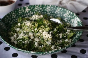 I added that to 1/2 a box of cooked orzo pasta and some pea shoots and lettuce leftover from last weeks CSA share and the mint from this week’s CSA share.
