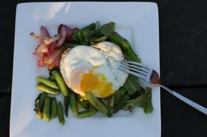 This was dinner. Turnips, snap peas, the last of last week’s lettuce mix and an egg.