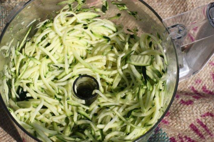 Trim ends off zucchini and grate them either on the large holes of a box grater or, if you have one, using the shredding blade of a food processor.
