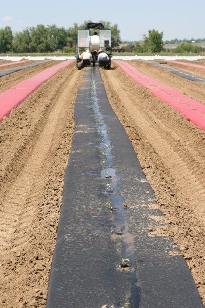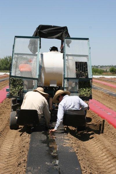 Two people sit on the back of the waterwheel and the tractor pulls them along the row to be planted. The tractor has already been down that row and put down red or black plastic mulch and drip tape.