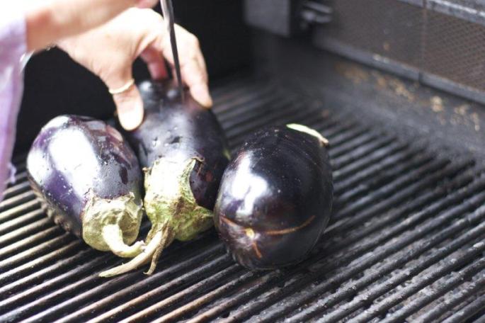 Heat up your grill and put the eggplant right on the grill, make a few slits in your eggplants so they don’t explode.