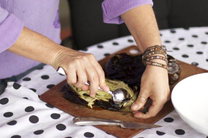 When the eggplant are charred all over, and really black and crunchy take them off the grill and let them cool so you can touch them without burning yourself. You are going to scoop out the flesh and get rid of the charred skin. Both these recipes use only the flesh of the eggplant.