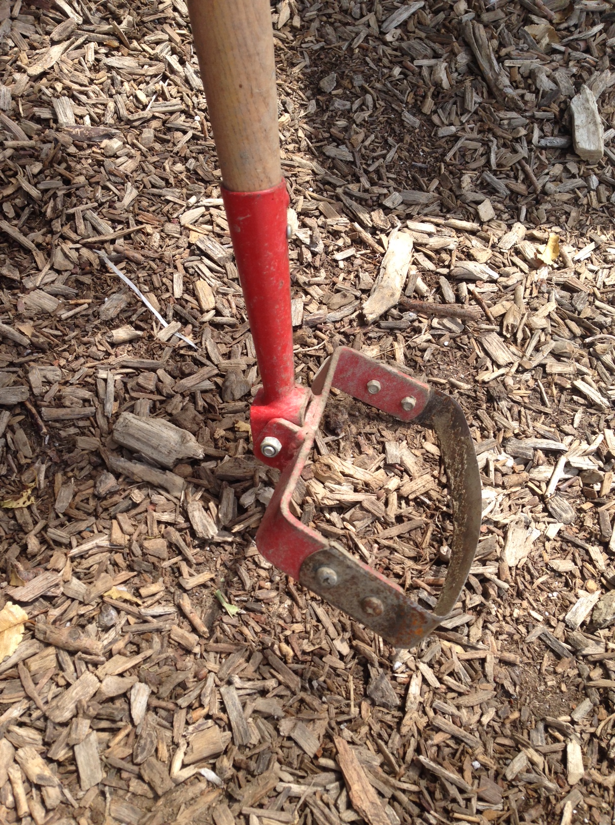 Then, there are some tools that aid the weeding- bludgeon hoes, long skinny shovels, pitch forks. Of all these, my favorite is something we call a scuffle hoe. Like any other tool, it has a long wooden handle, but on the end, instead of the normal spade-type blade, it has a thin looping blade 1 1/2 inches wide. Instead of hacking away at the weeds with a large swooping motion from the shoulder, with the scuffle hoe, you place the blade on the ground and push it under the surface of the soil and pull back and forth. This cuts the roots and is quick and effective on young tender weeds.