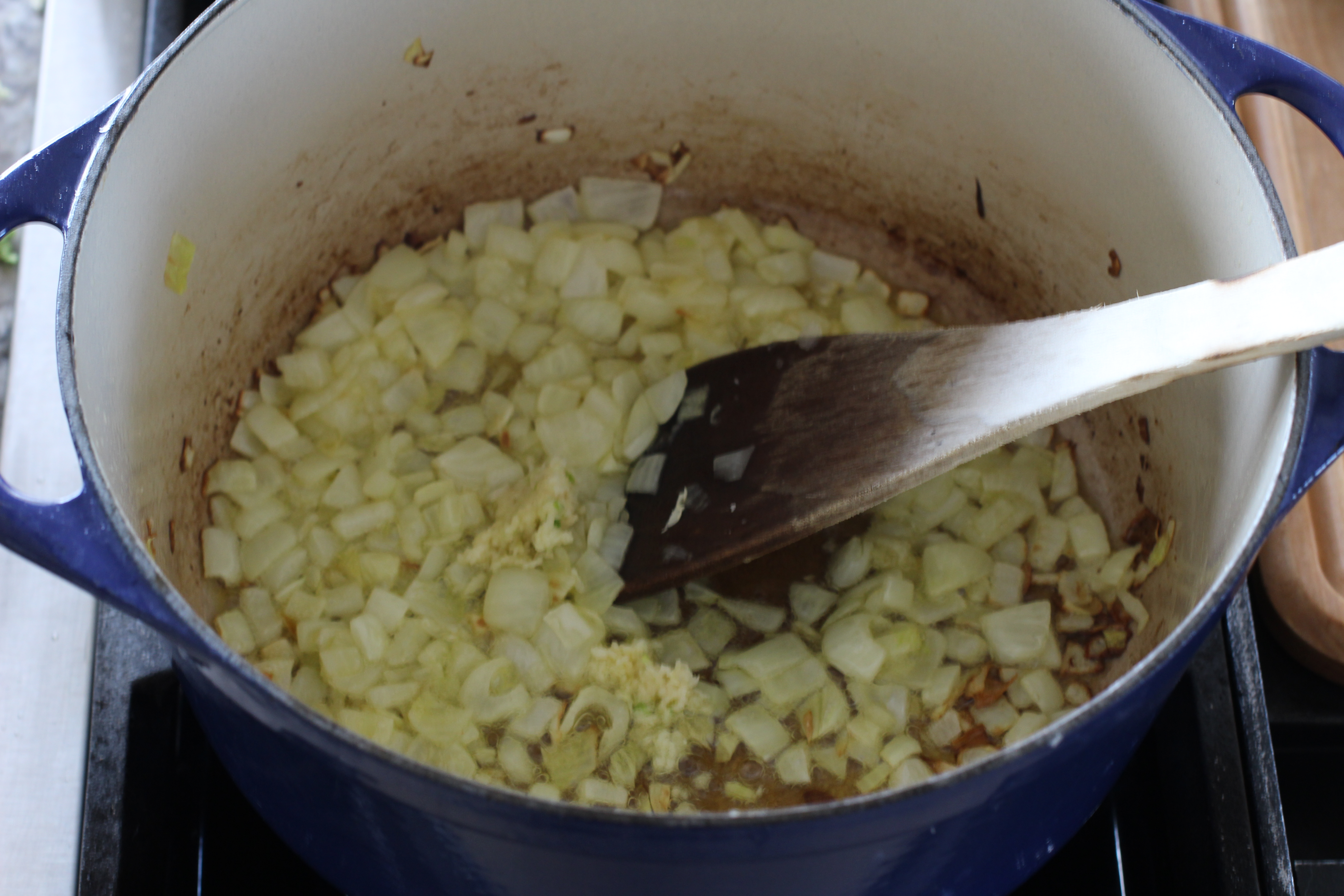 Start with 1/2 cup of olive oil and diced onions in a large pan with a tight fitting lid. It seems like a lot of oil but that is part of the magic of this dish. The oil cooks down differently than water or broth.