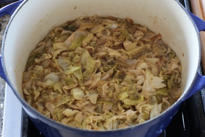 Add the shredded cabbage and toss it until the oil covers everything evenly. I forgot to take a picture of that. It filled up the pot but quickly collapsed down to look like this.