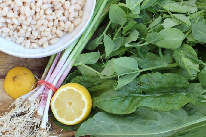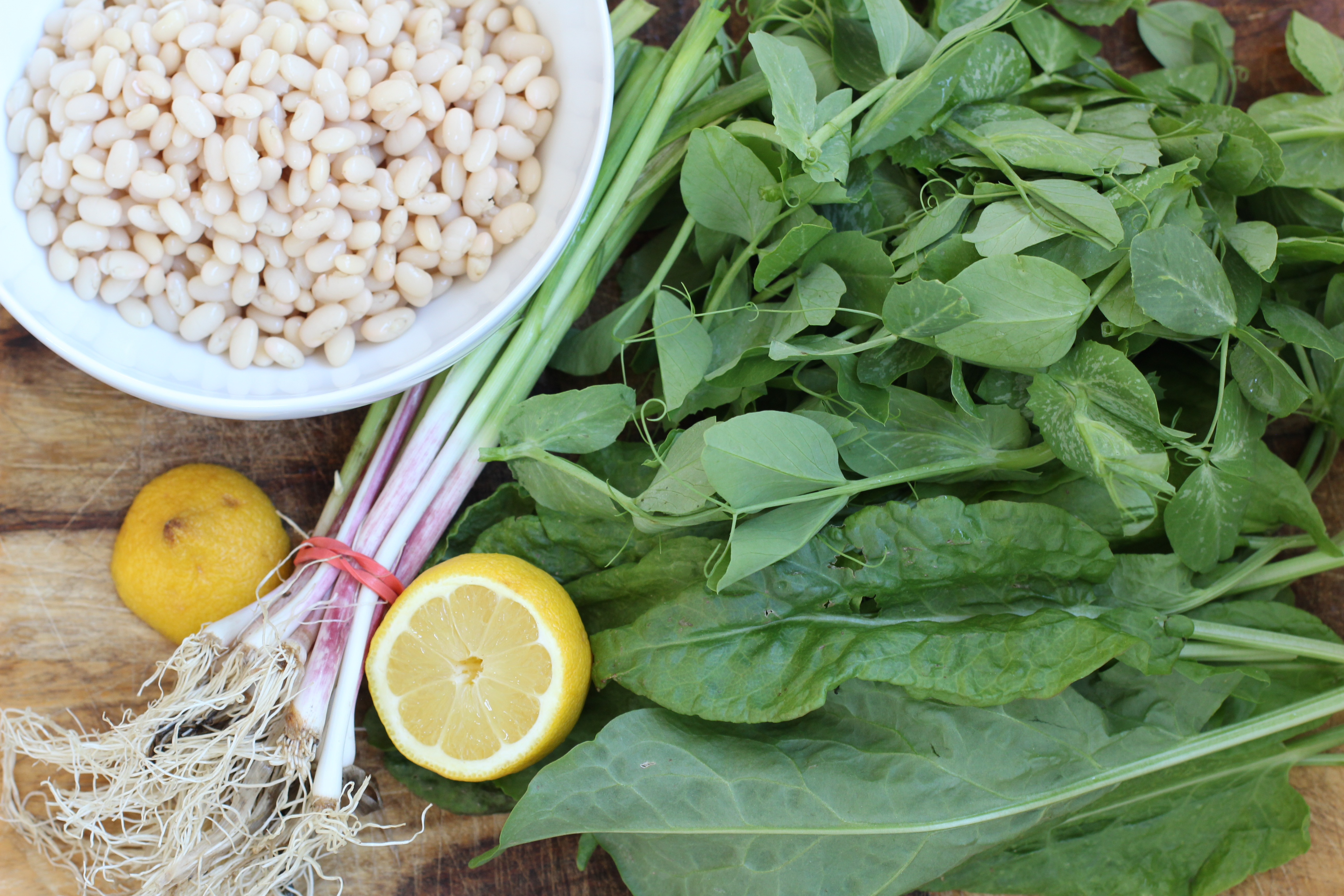 This is all you need to make this; some beans (I cooked my beans, I’m sure you could use canned) a bunch of sorrel and I added pea shoots too, and some green garlic or onions and lemon.