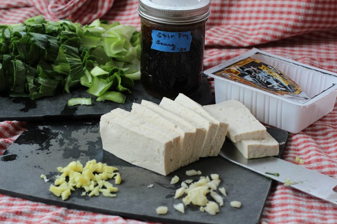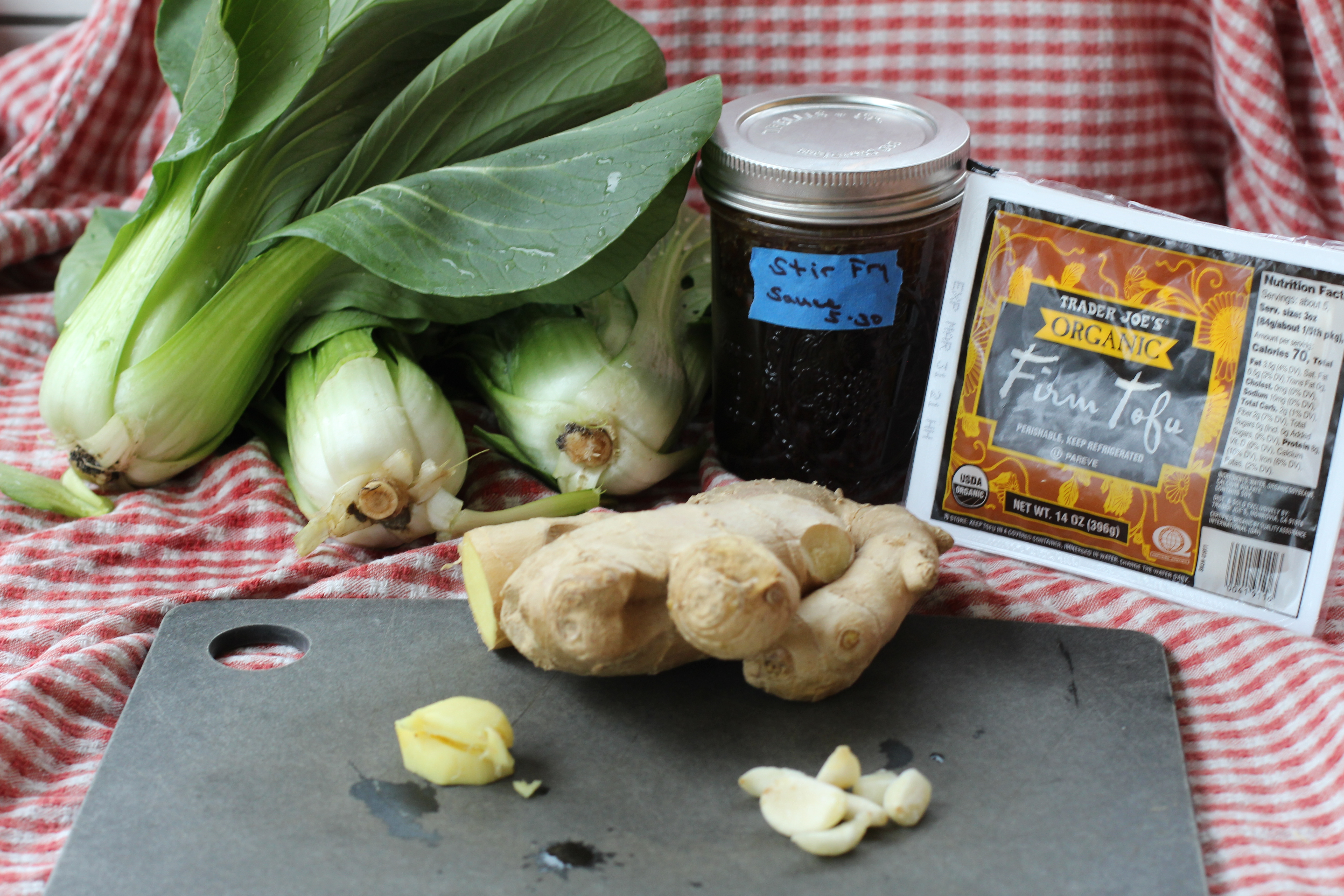 This is what I had, Bok choy, garlic, ginger, tofu and some sauce I premade. The recipe is below.