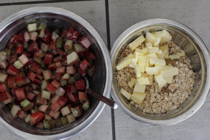 Put all the filling ingredients in a bowl and mix and put all the topping ingredients in a separate bowl and mix with a pastry cutter or just use your hands. This picture is before I mixed the topping ingredients.