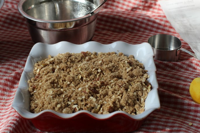 Put your filling in a baking dish then top with the oat mixture that is really well mixed. It should look like this.