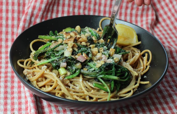 The other thing I love love love is to really quickly wilt this mix with any alliums I have on hand with some oil and butter and mix some hard cheese and a squeeze of lemon and put that on top of whatever our main dish is.