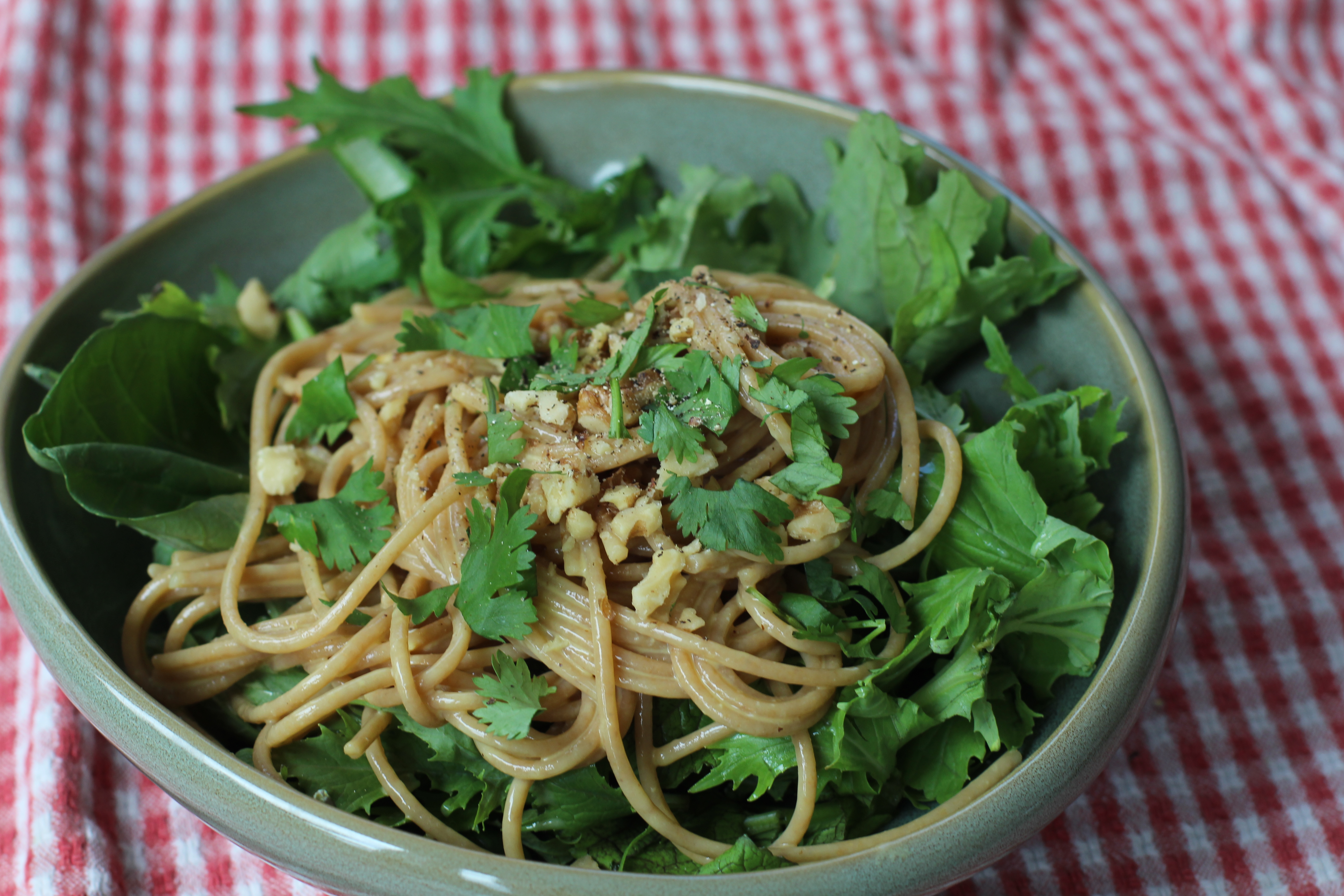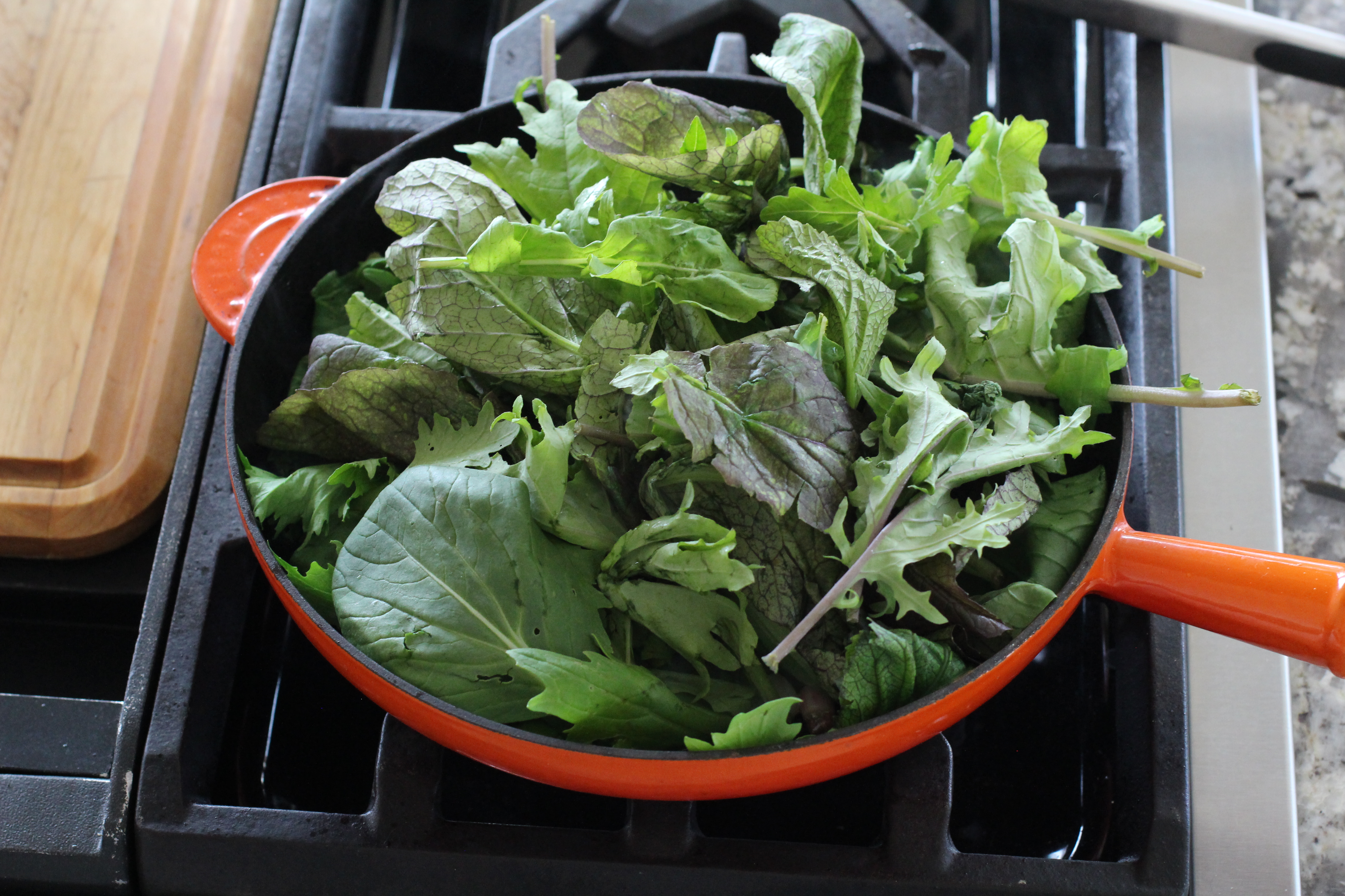 Then I put what ever hot dish we are having on top. The residual heat wilts the greens just a bit.