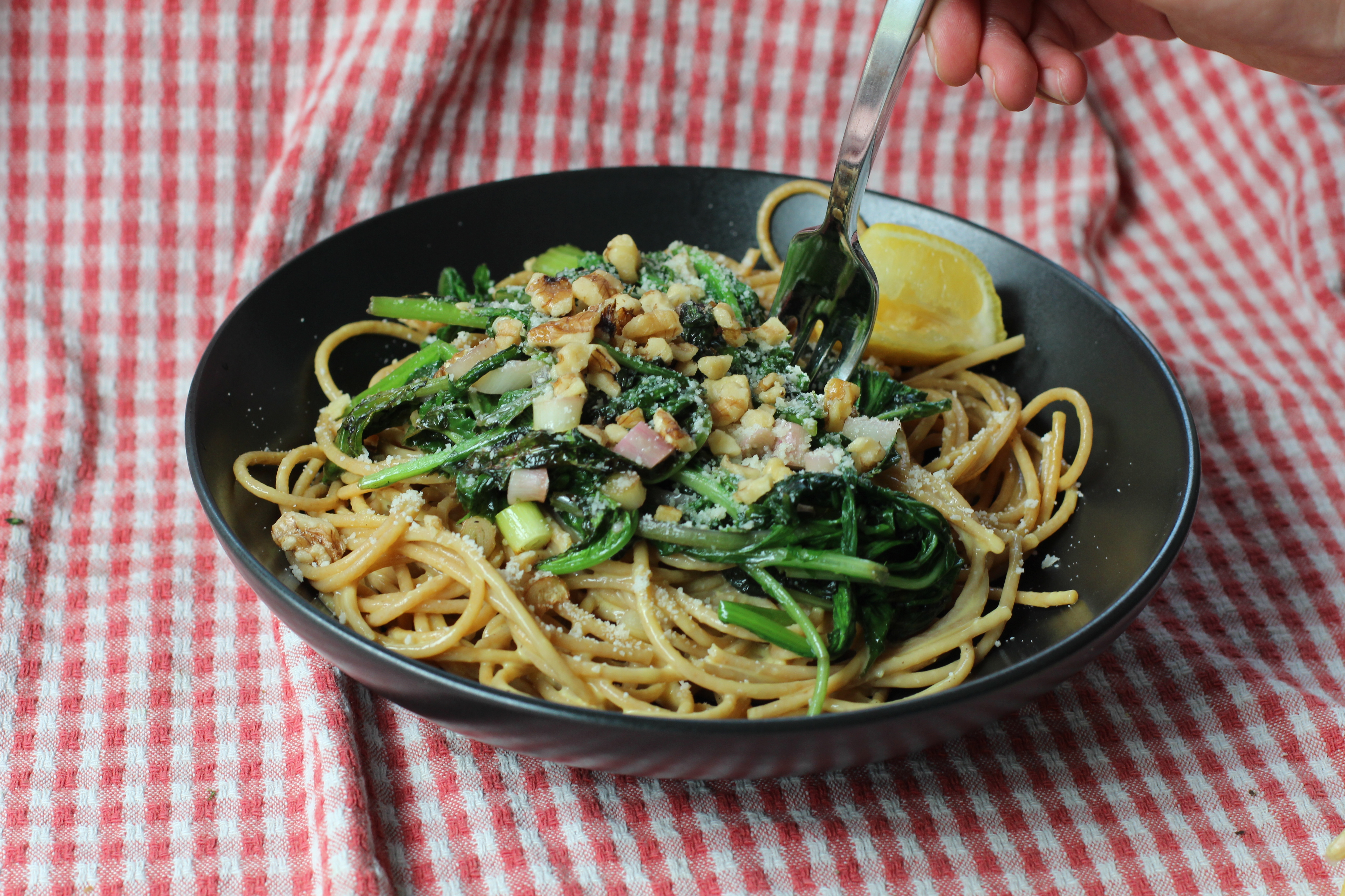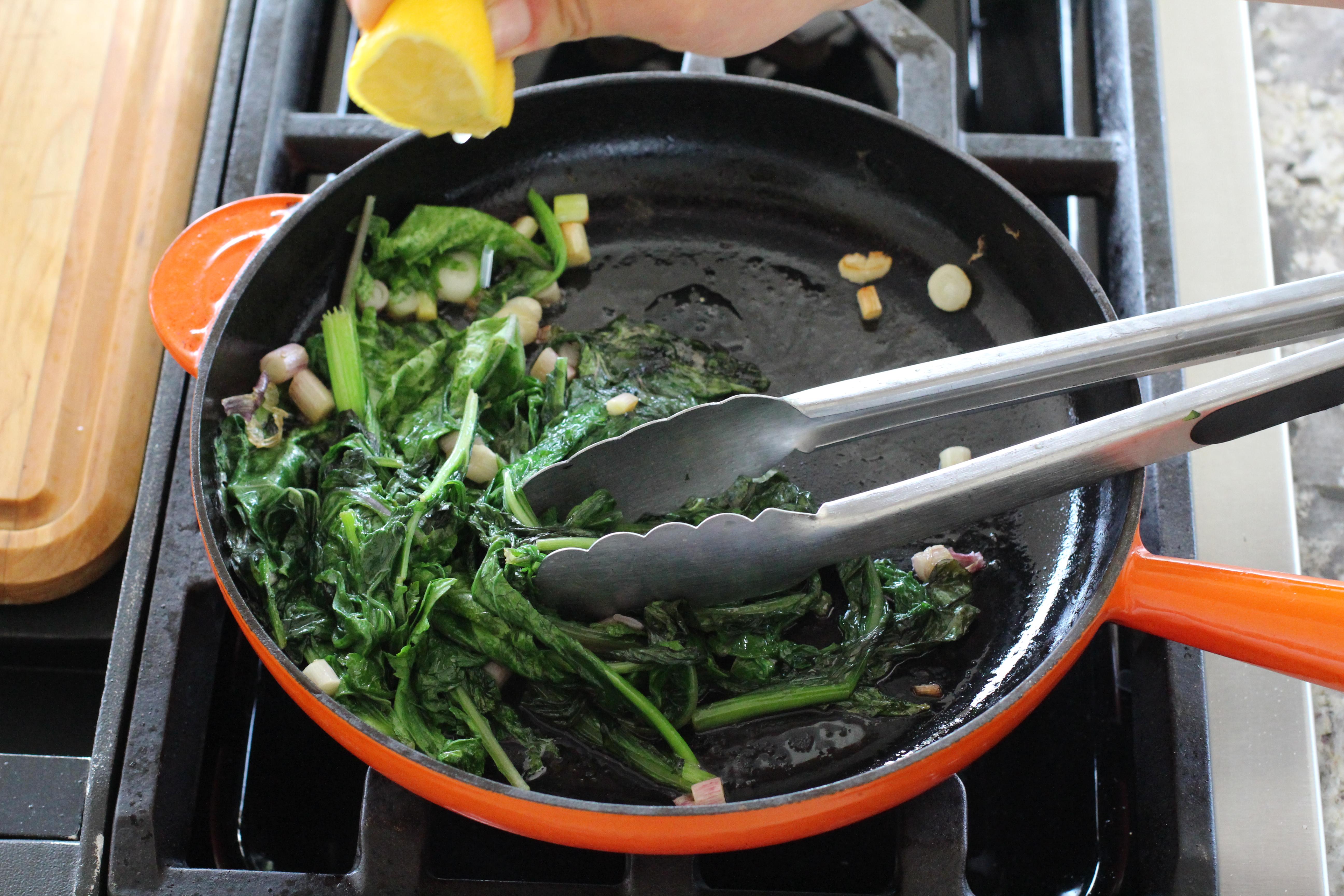 The other thing I love love love is to really quickly wilt this mix with any alliums I have on hand with some oil and butter and mix some hard cheese and a squeeze of lemon and put that on top of whatever our main dish is.