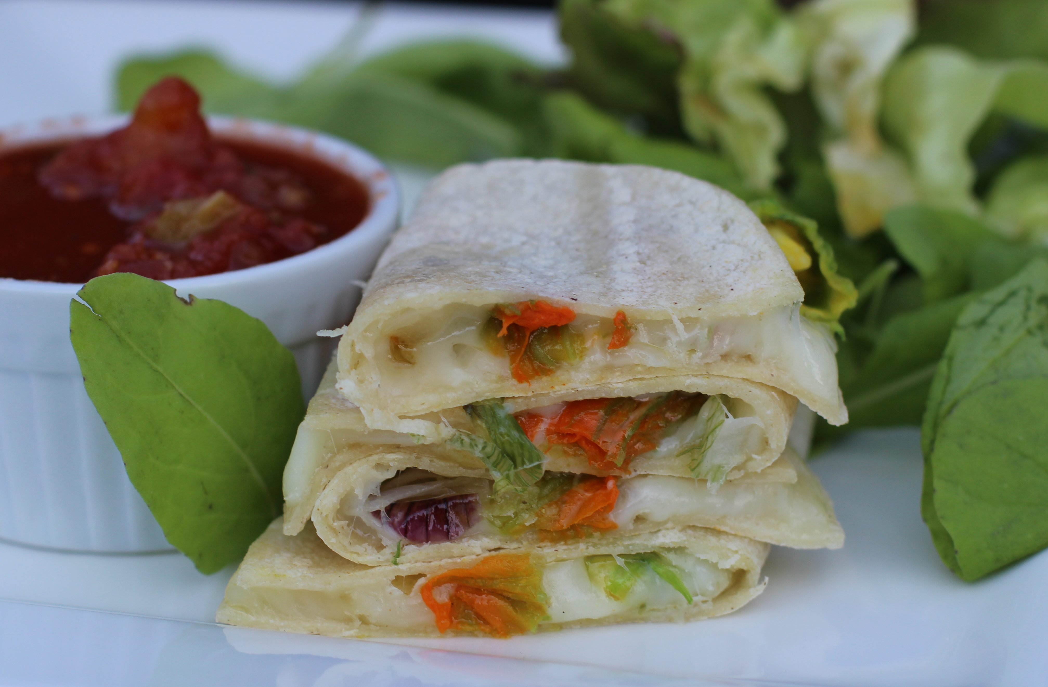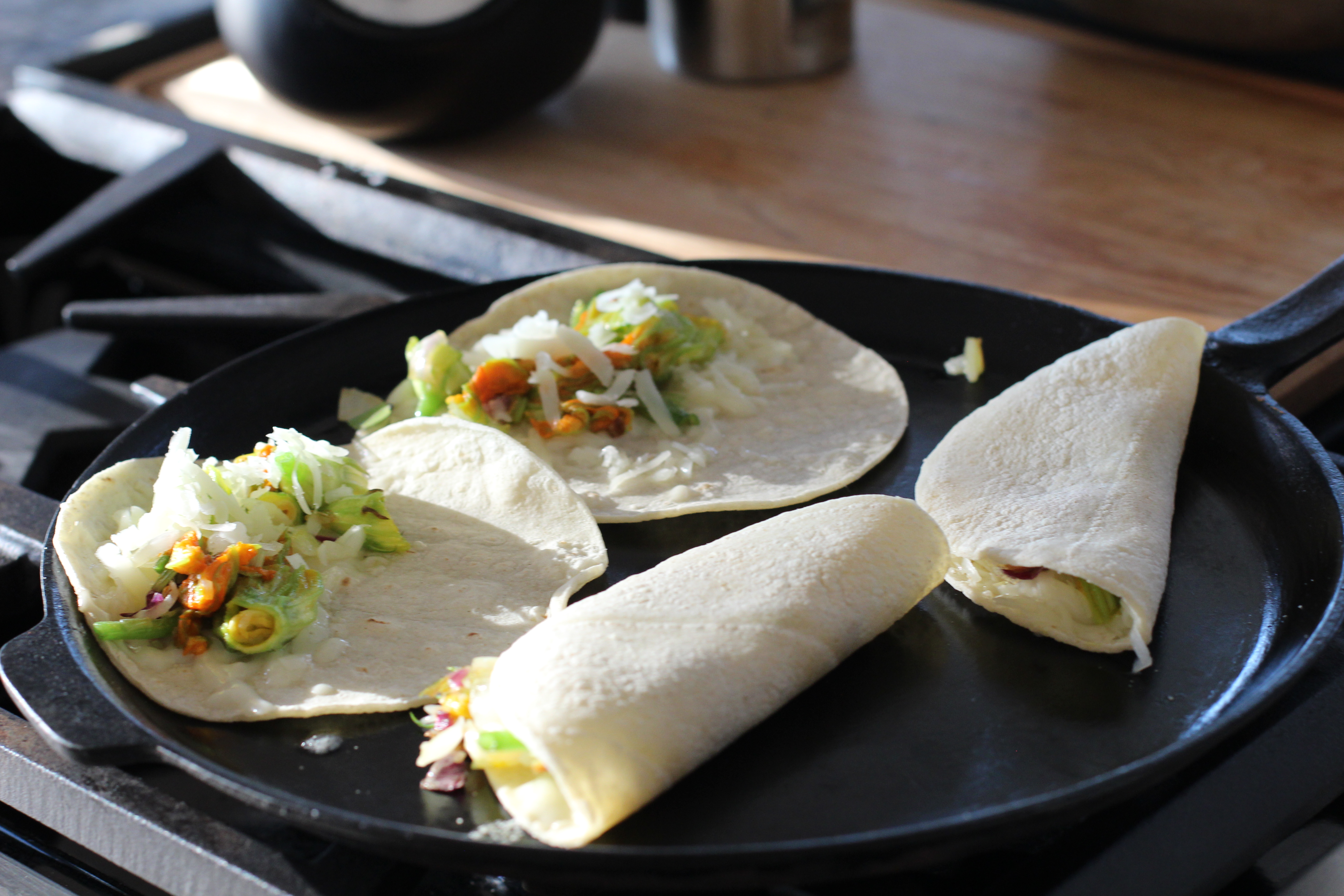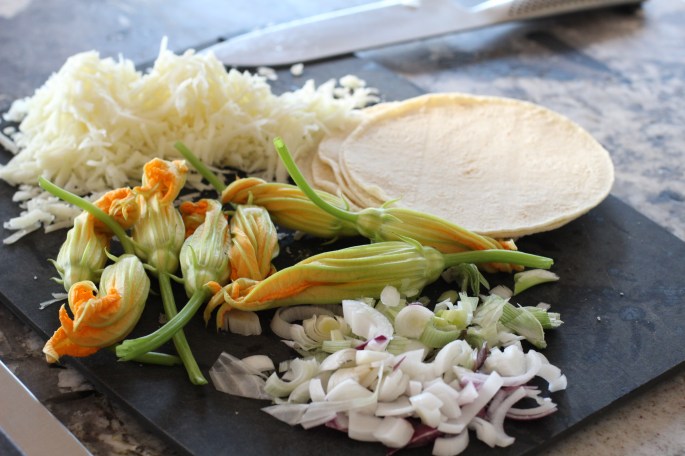 Corn tortillas, squash blossoms, some onions and Manchego cheese, any cheese that melts will do. This made 6 corn quesadillas.