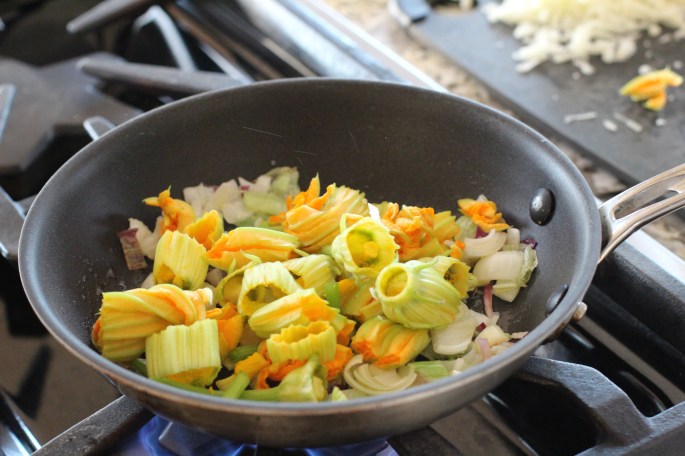 I like to sauté a little onion in oil until they are soft, then I add the squash blossoms to just wilt them. Lots of recipes say to cut off them stem, I love the texture and light zucchini flavor of the stem. I chop up both the blossom and stem up.