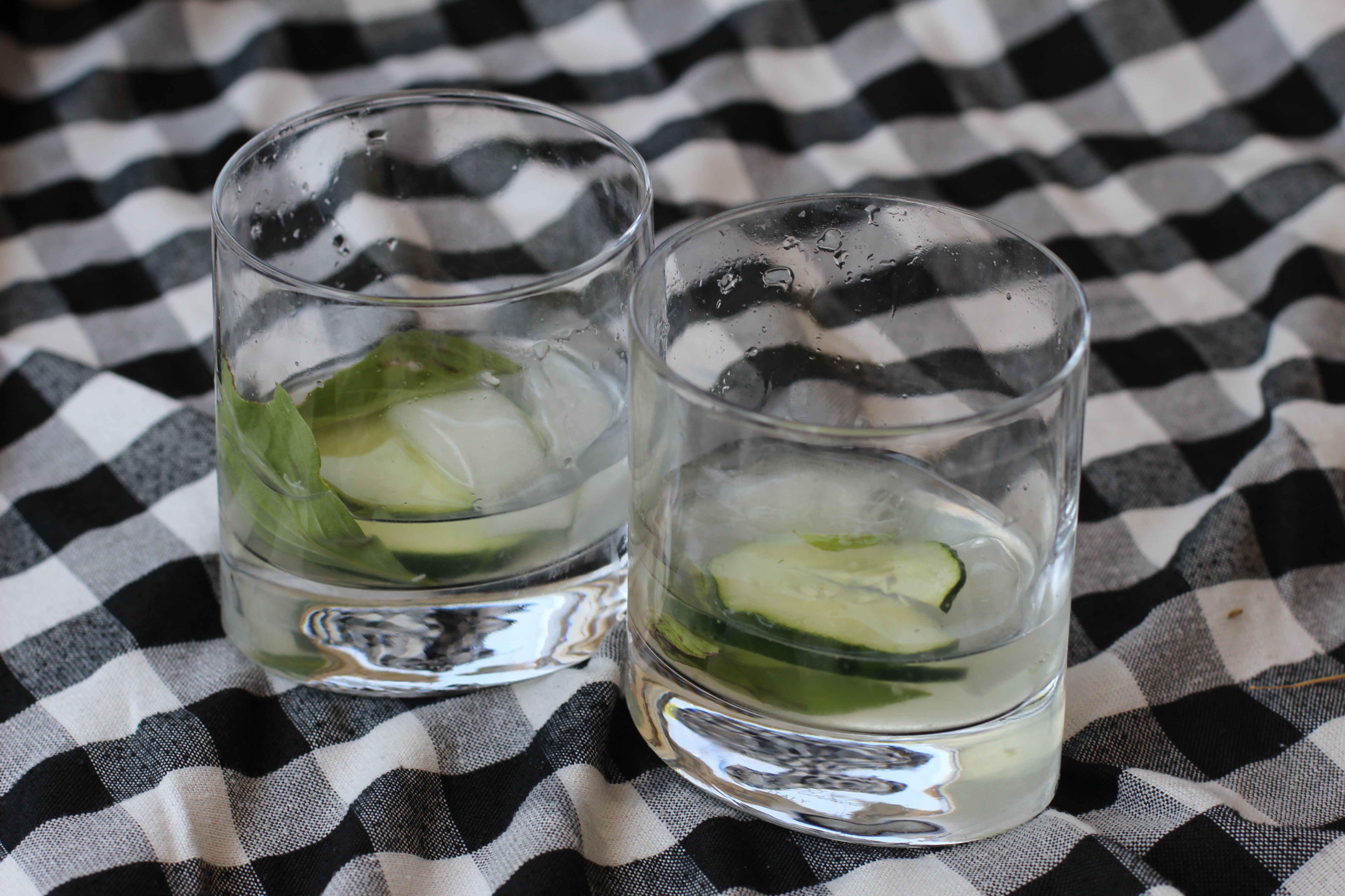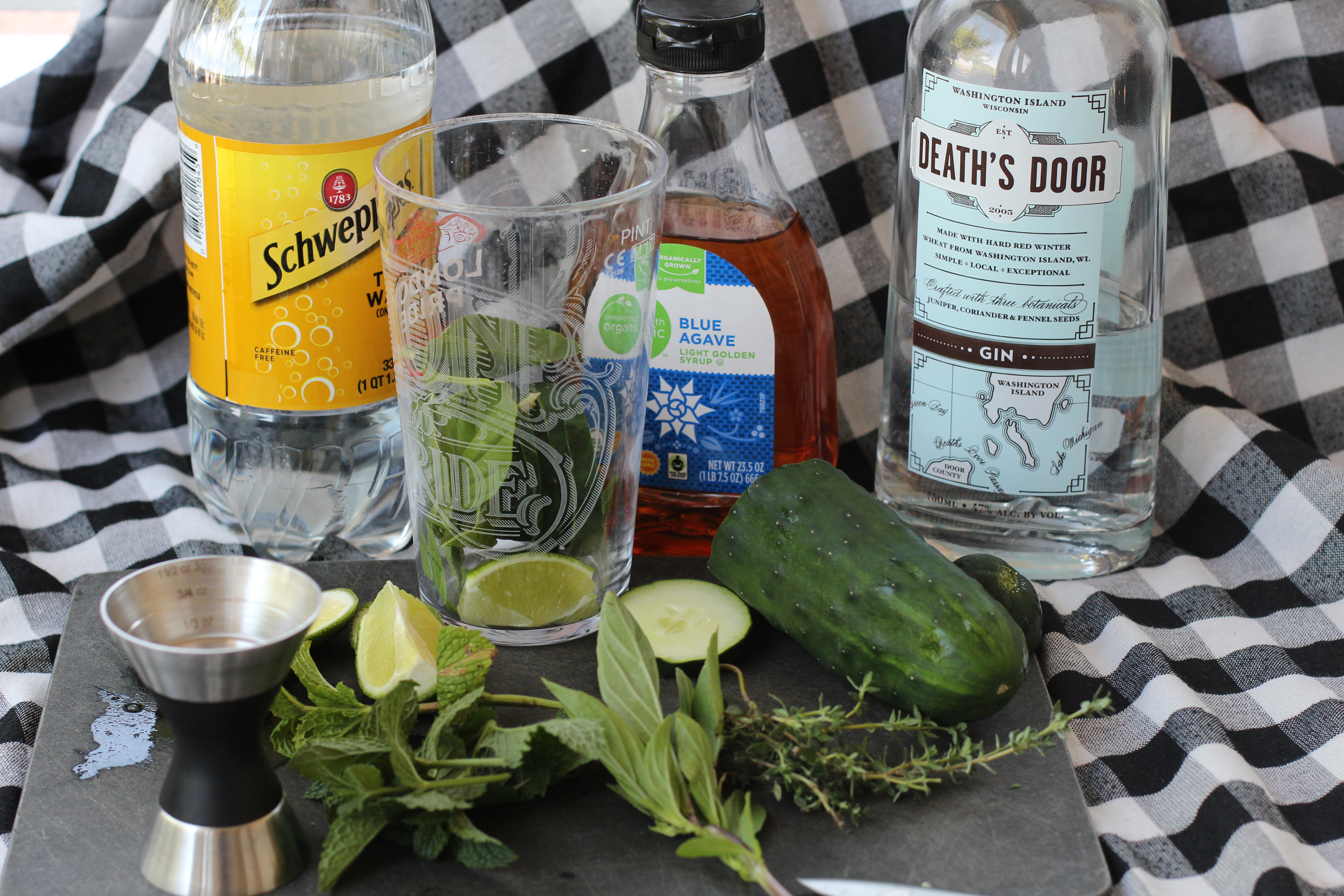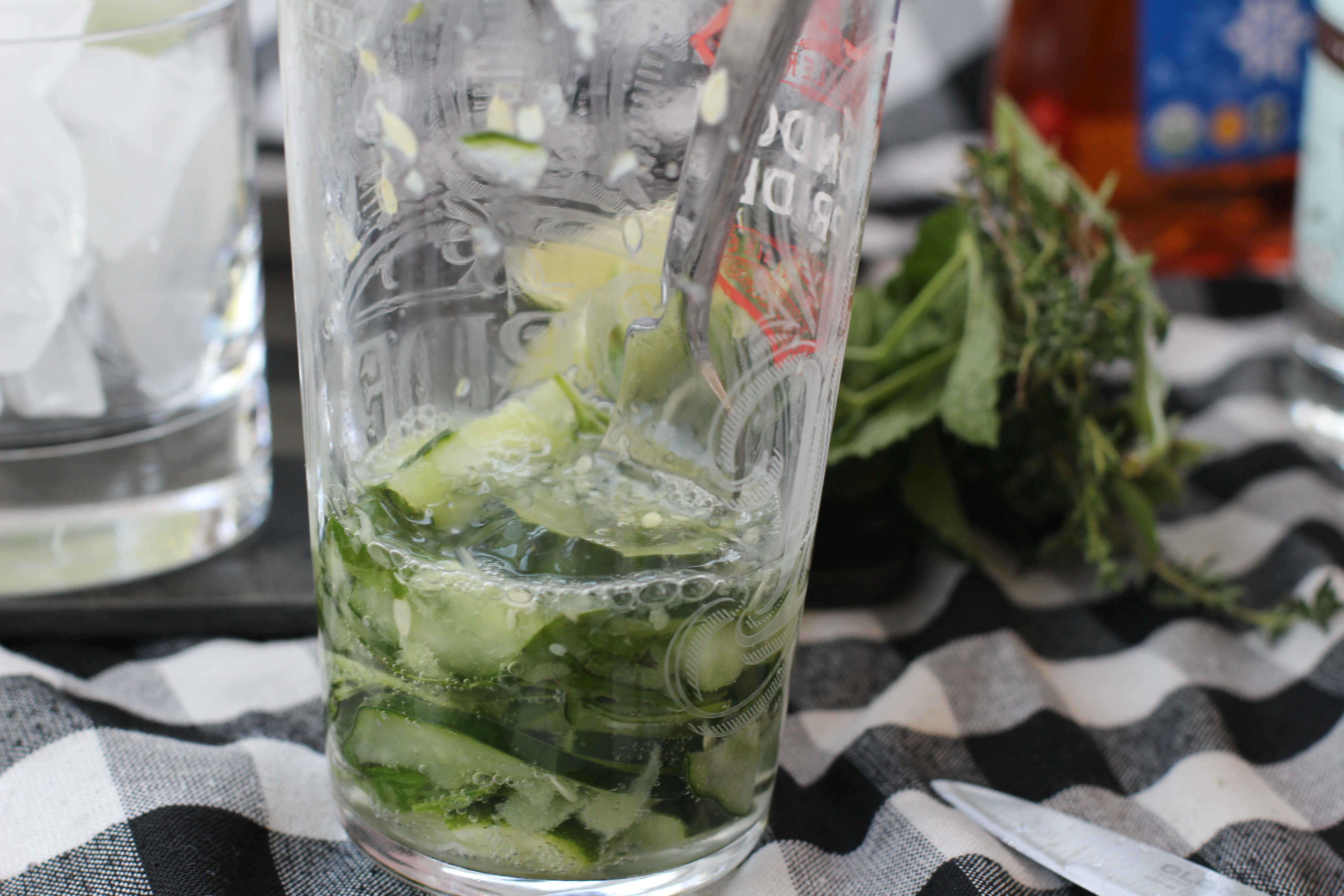 Add mint, cucumber, lime, gin, and agave or (equivalent if using) to a pint glass and muddle (smash up) everything I used a fork.