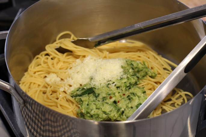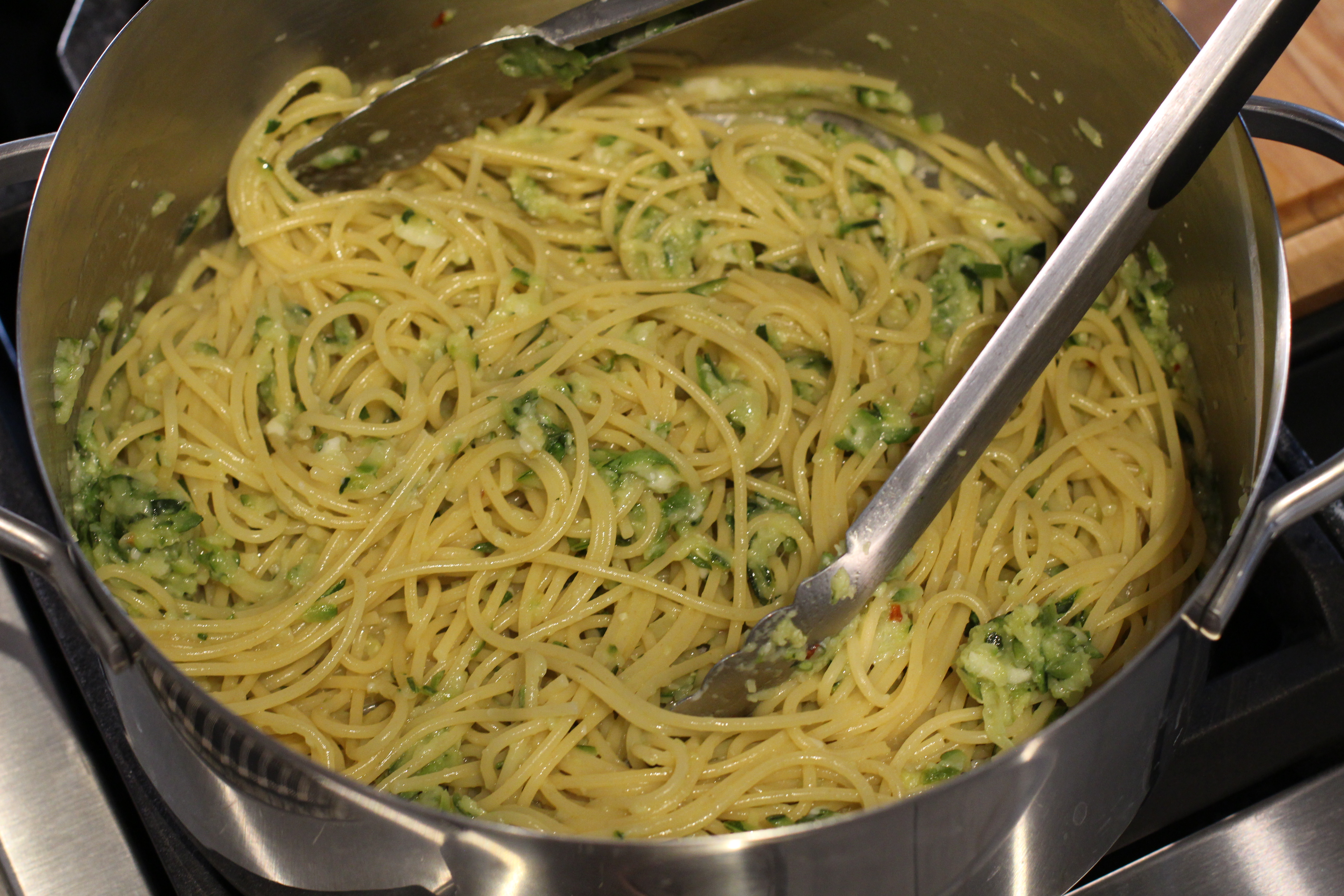 To make zucchini butter pasta follow this recipe and add it to a cooked half box (8 ounces) of spaghetti or any pasta. I used the whole amount of zucchini butter, that was enough for two of us for dinner and two lunches today. I added a little parmesan cheese. You can leave that out of course.