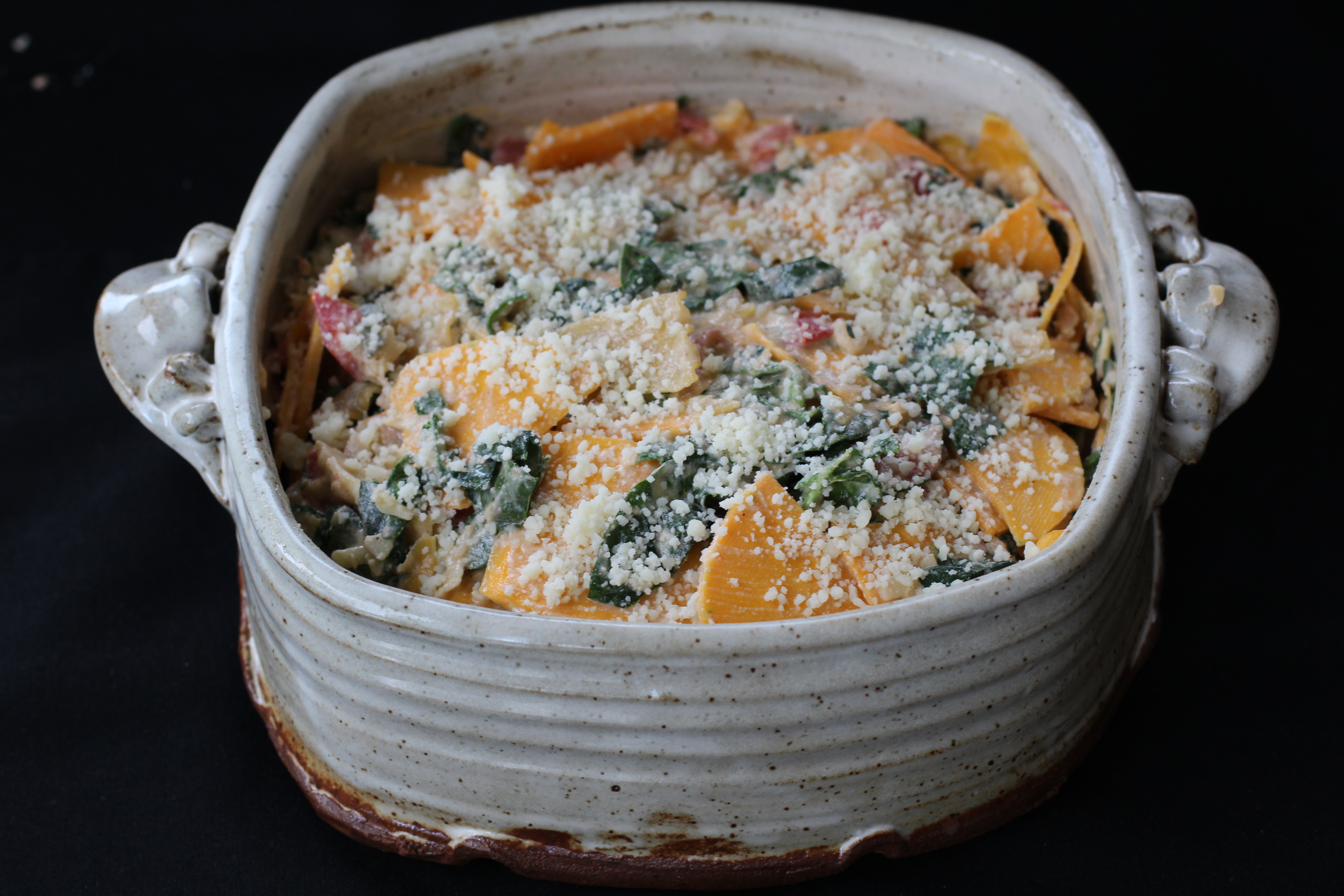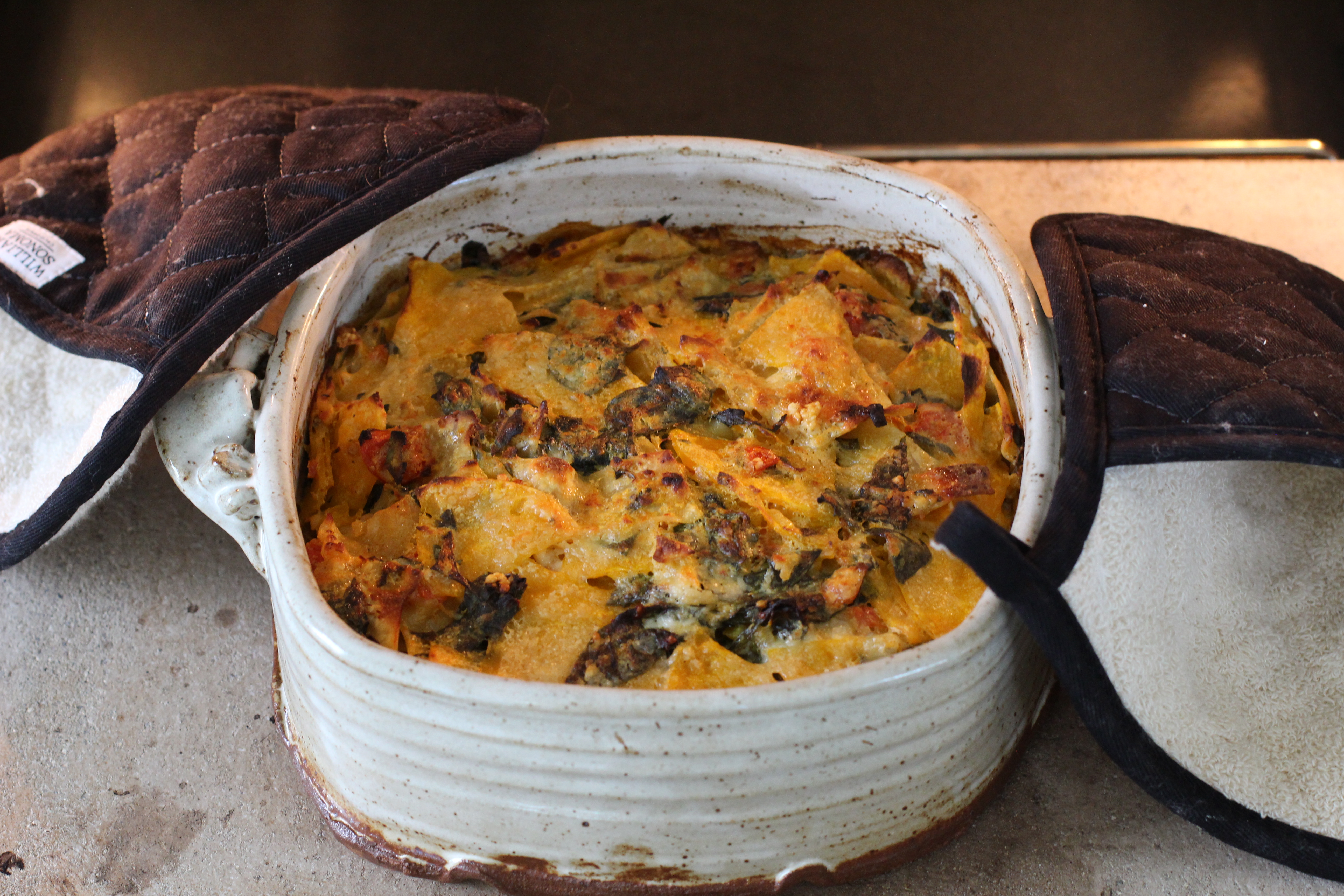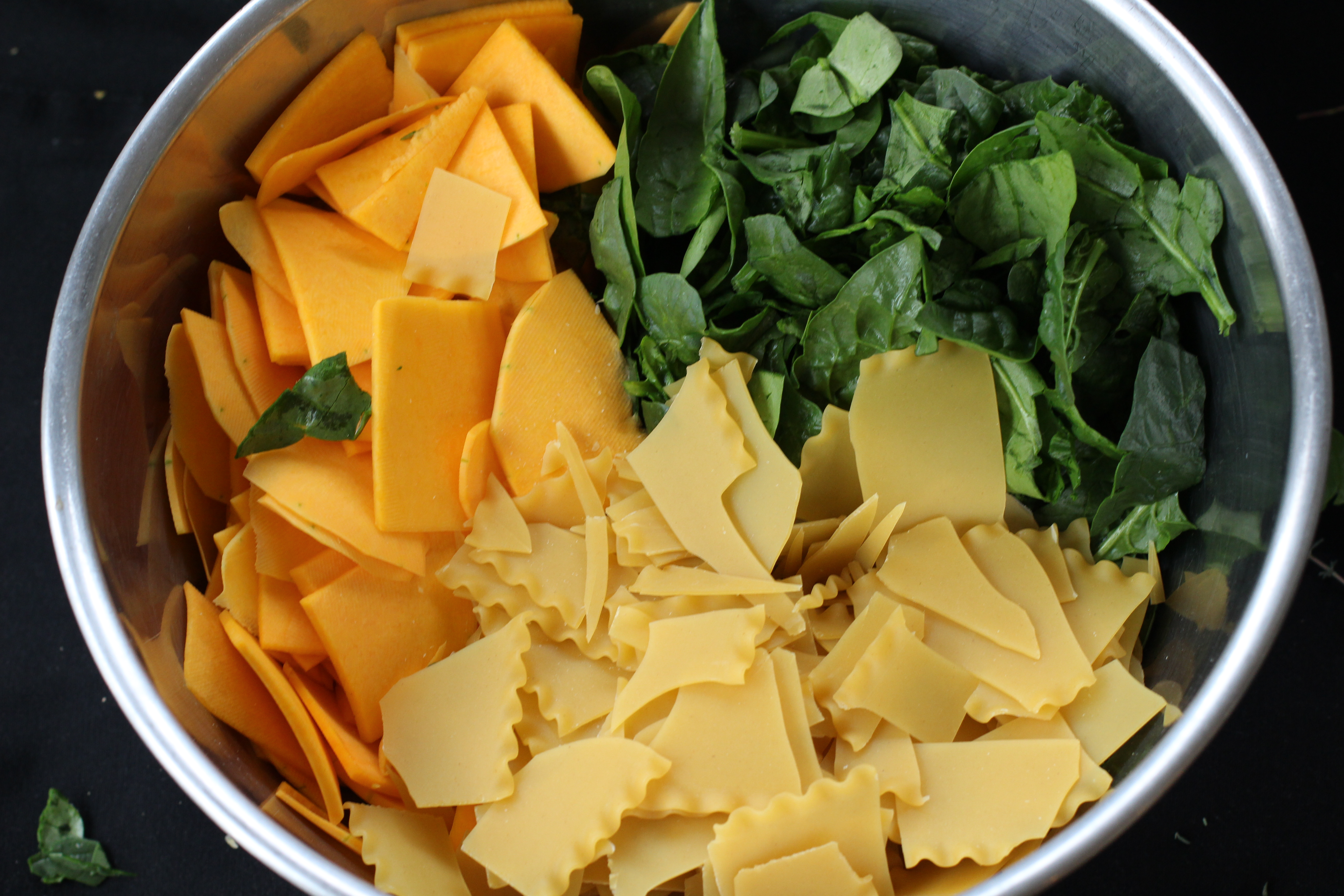 I saw this Yotam Ottolenghi recipe in the Guardian a while ago and was intrigued. You basically thinly slice or cube winter squash, add a few other ingredients, mix it and and bake. There is no roasting the squash first, no boiling the pasta. The one hitch in that recipe is it calls for fresh lasagna noodles. Thus the reason I hadn’t made it. I rarely make pasta from scratch.