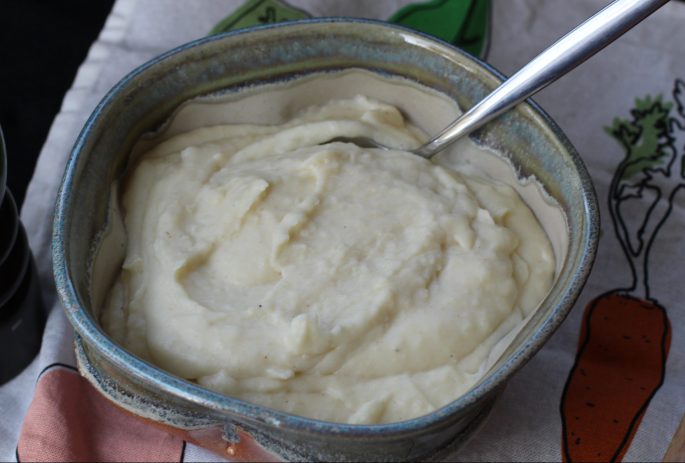 The rice in this dish gives it a firmer texture than a puree using only celeriac but lets the celeriac flavor shine on it’s own. The milk makes it luxurious without being heavy like mashed potatoes made with cream and butter.