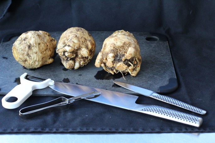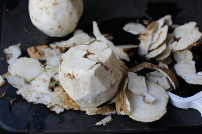 Don’t let it’s looks intimidate you. Celeriac isn’t much harder to deal with than a potato. Let’s break this task down. Grab your celeriac and a knife and peeler you are comfortable handling.