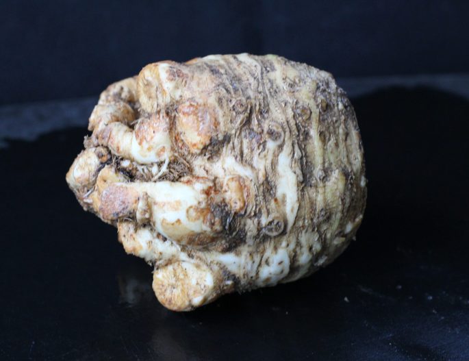 Put the celeriac on it’s side and lob off the bottom gnarly root. I cut at an angle to make a point at the bottom of the root, making sure to cut away from the hand holding the celeriac.