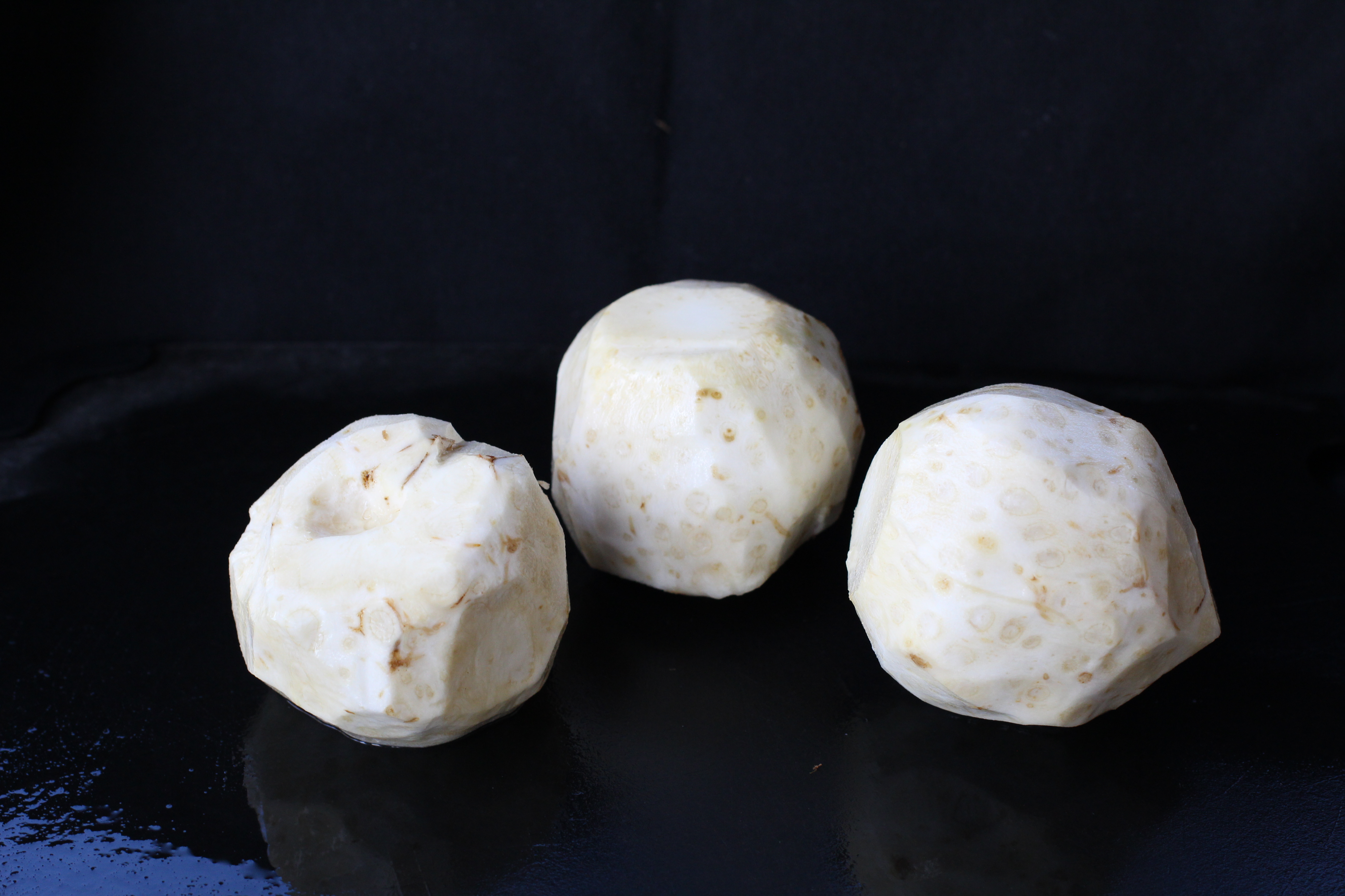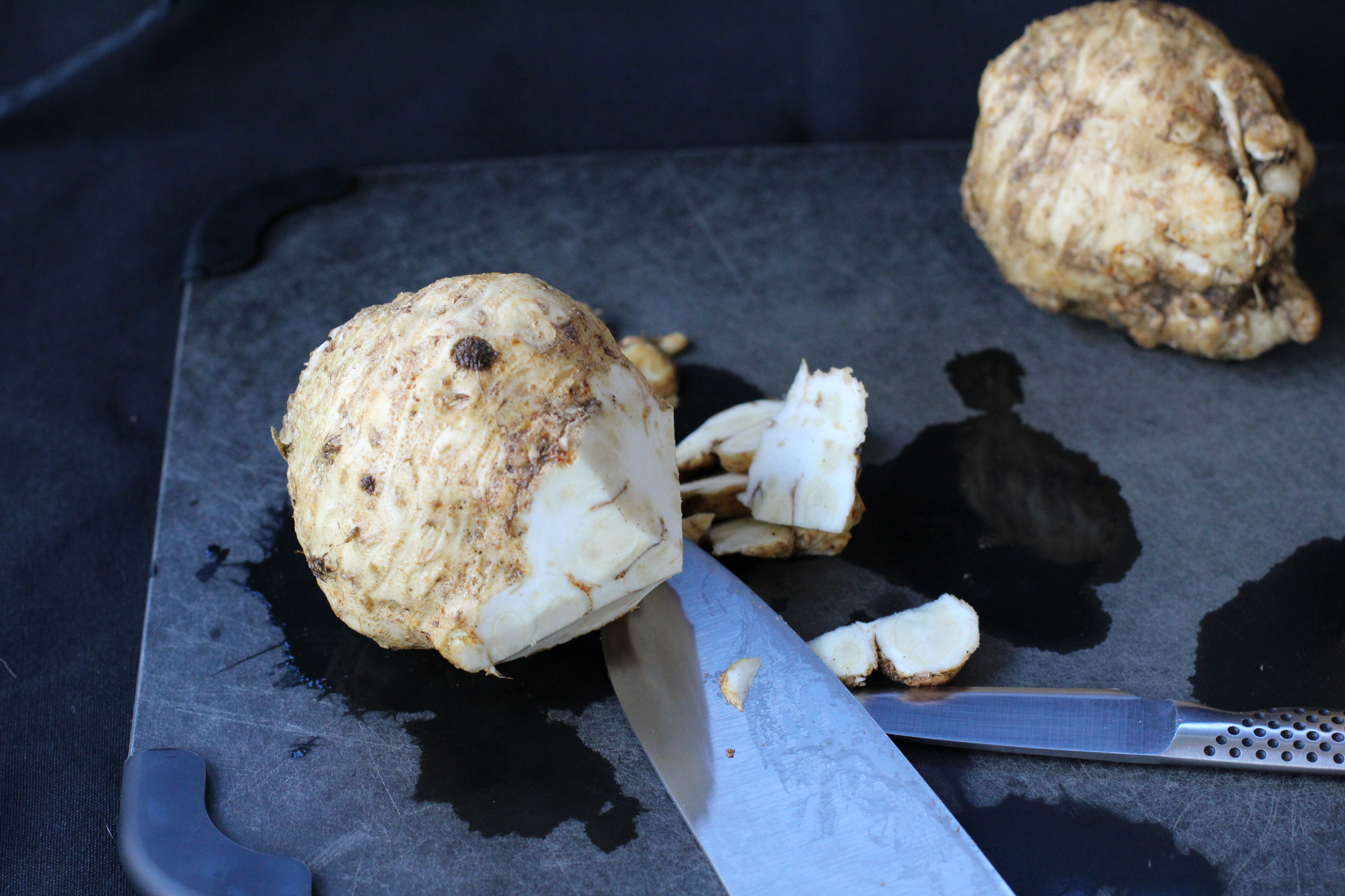 Put the celeriac on it’s side and lob off the bottom gnarly root. I cut at an angle to make a point at the bottom of the root, making sure to cut away from the hand holding the celeriac.