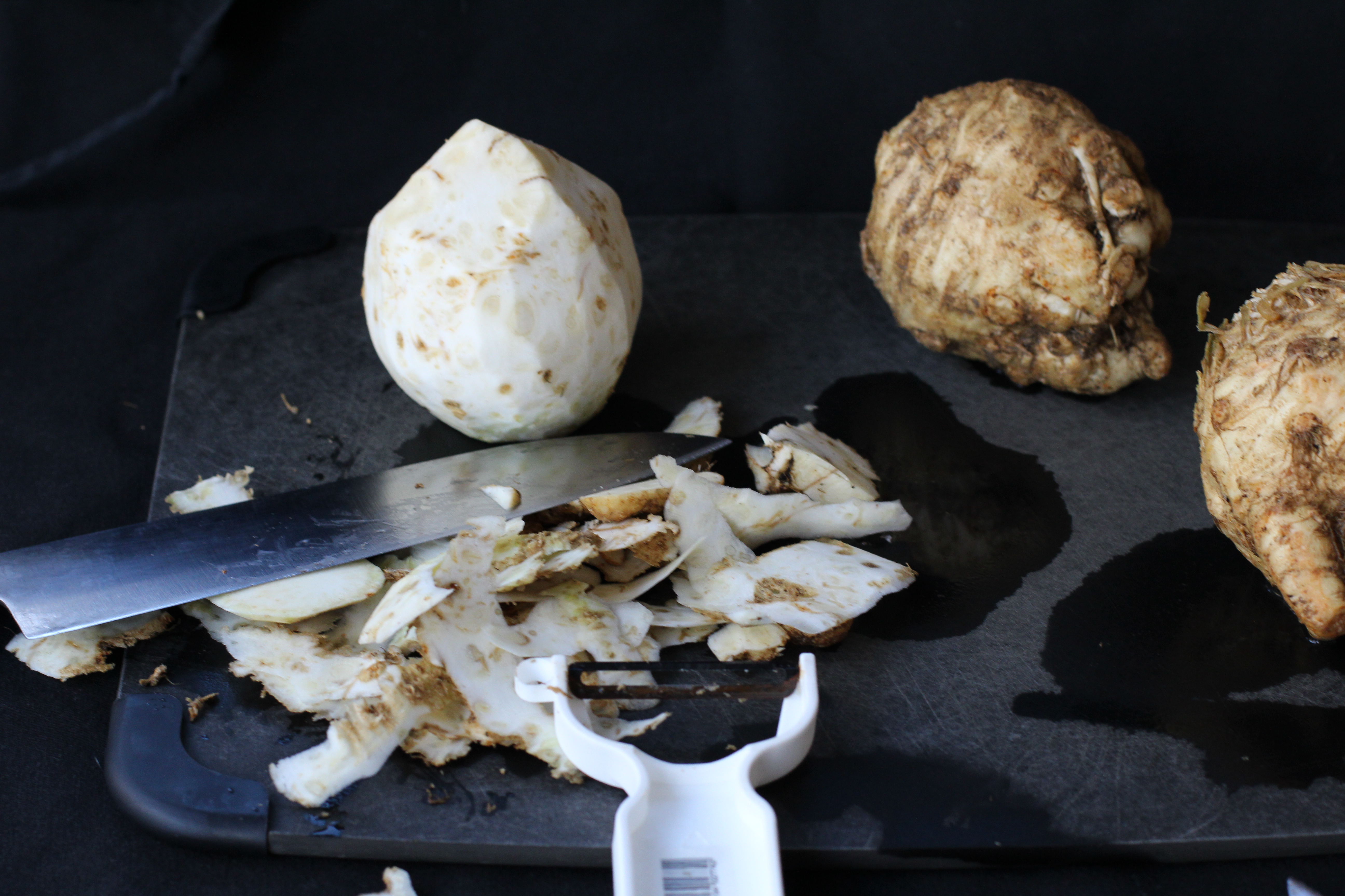 Don’t let it’s looks intimidate you. Celeriac isn’t much harder to deal with than a potato. Let’s break this task down. Grab your celeriac and a knife and peeler you are comfortable handling.