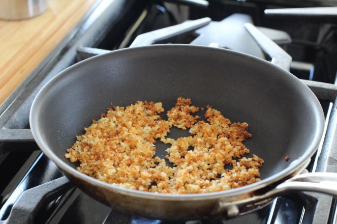 Heat 1 tablespoon olive oil in a medium skillet over low heat. Add the panko and cook, stirring often, until lightly browned and crisp, 3 to 5 minutes. Transfer to a bowl or plate, then return the pan to the heat.