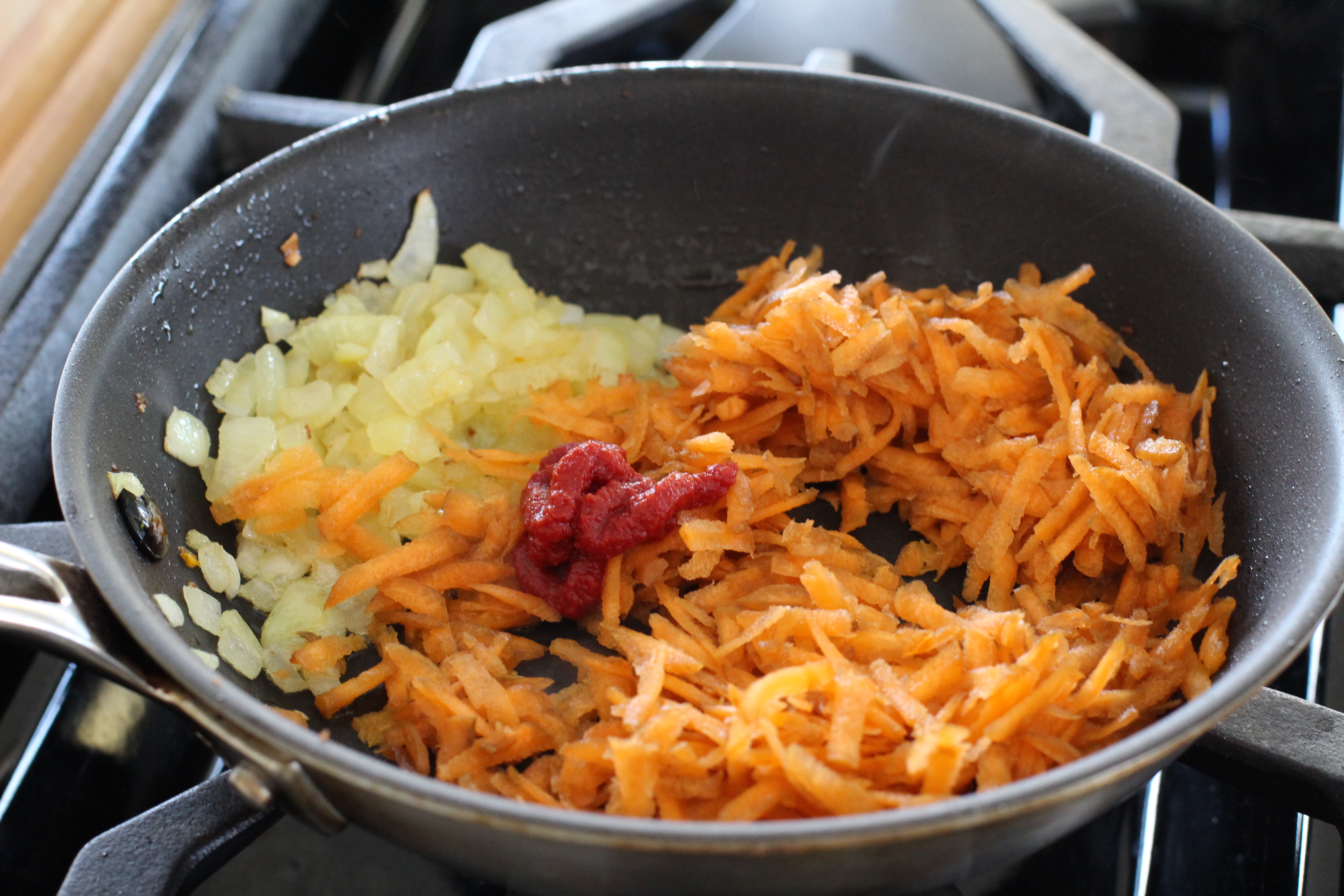 Add 2 tablespoons olive oil to the skillet, followed by the onion. Cook until softened and lightly golden, 8 to 10 minutes. Stir in the tomato paste, salt, and carrots and stir frequently until the carrots are soft and a bit blistered, another 8 to 10 minutes. Add the vinegar, scraping up all the browned bits until the pan is dry.