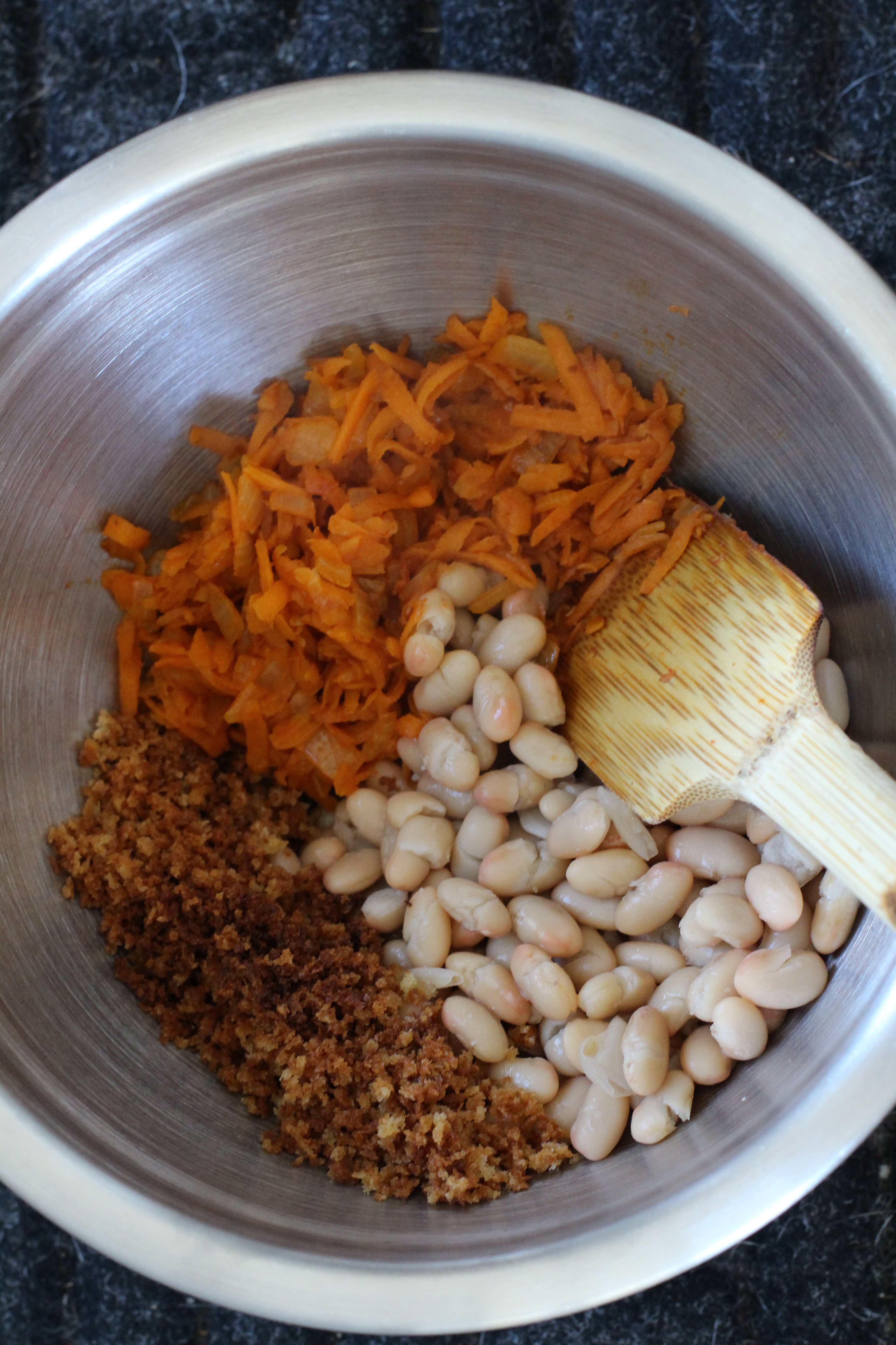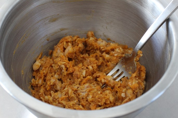 Remove from the heat and add the toasted panko and beans. Use a wooden spoon or spatula (I used a fork) to very coarsely mash the mixture until a bit pasty and holds together—there should still be plenty of beans intact. Stir in the egg and pepper to taste.