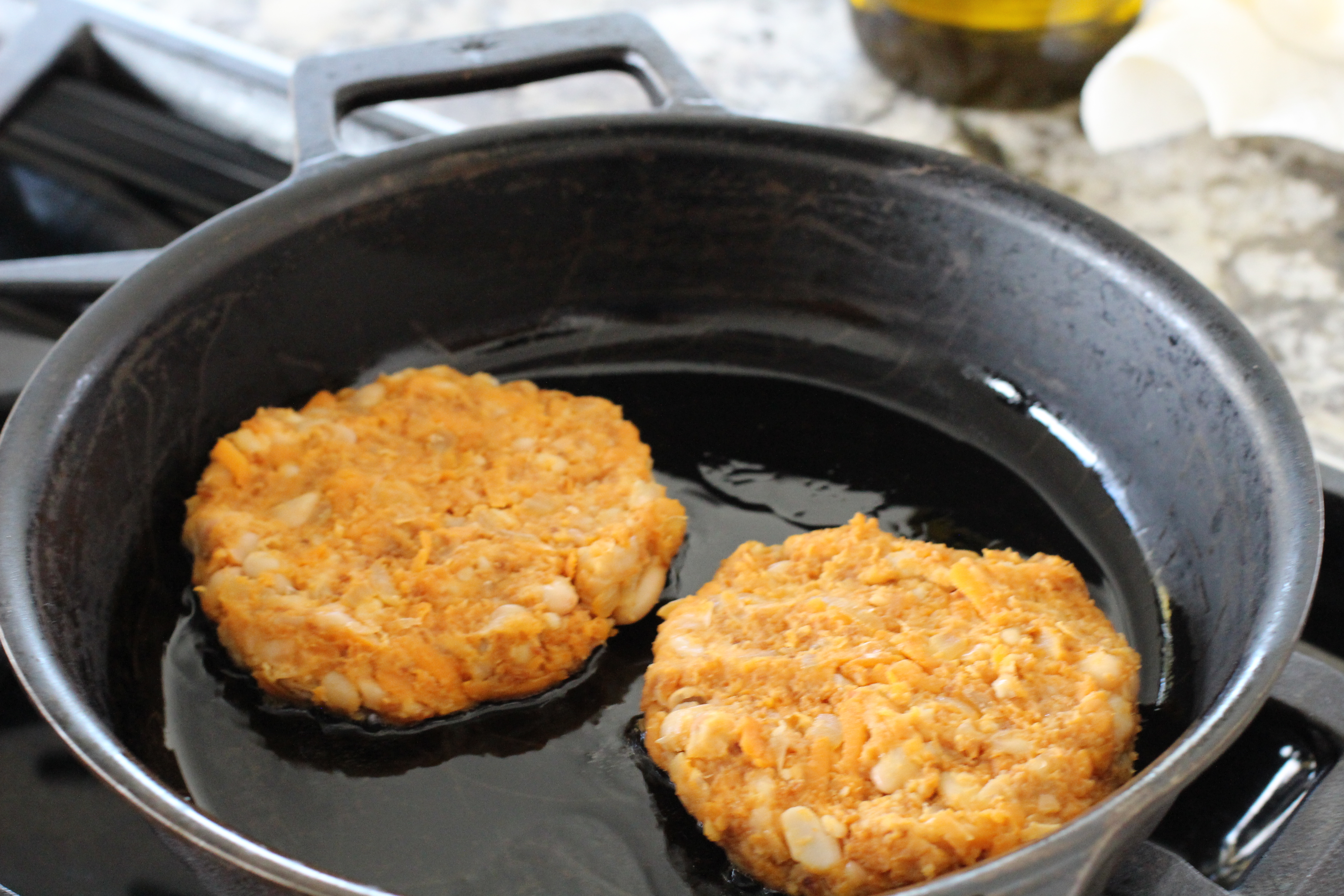 Shape into 4 patties, or 6 smaller burgers (I got 6, they were plenty big) or 10 to 12 sliders. To cook the burgers, heat a thin layer of olive oil in a wide skillet over medium heat and carefully cook until browned and slightly firm to the touch, 3 to 4 minutes per side. It may be necessary to cook in batches. Serve hot or at room temperature, with accompaniments as desired.