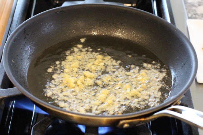 Let them gently sizzle until they are brown, don’t let them burn. Fish them out with a slotted spoon as they brown onto a plate. See my plate to the right of the pan with the browned garlic?