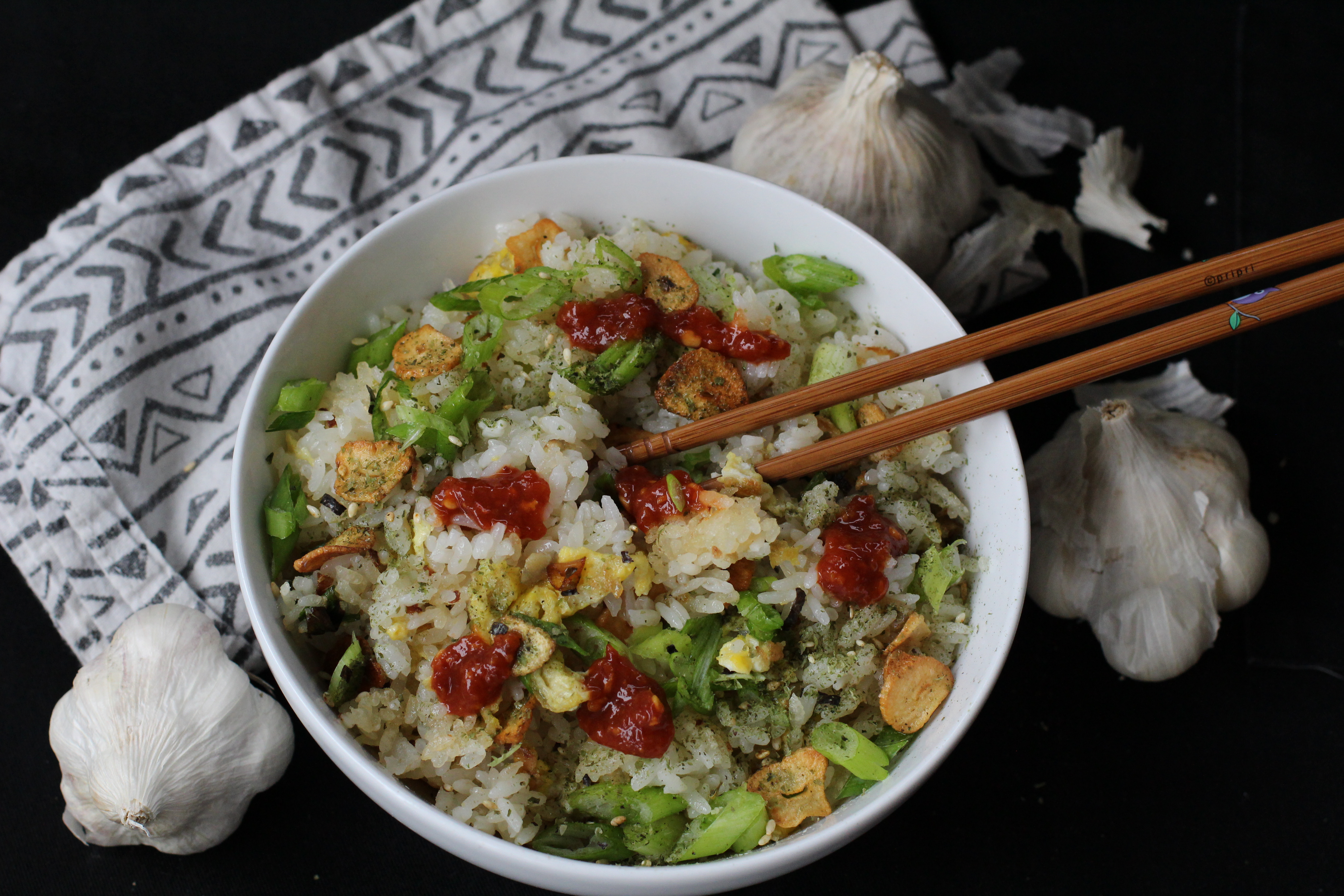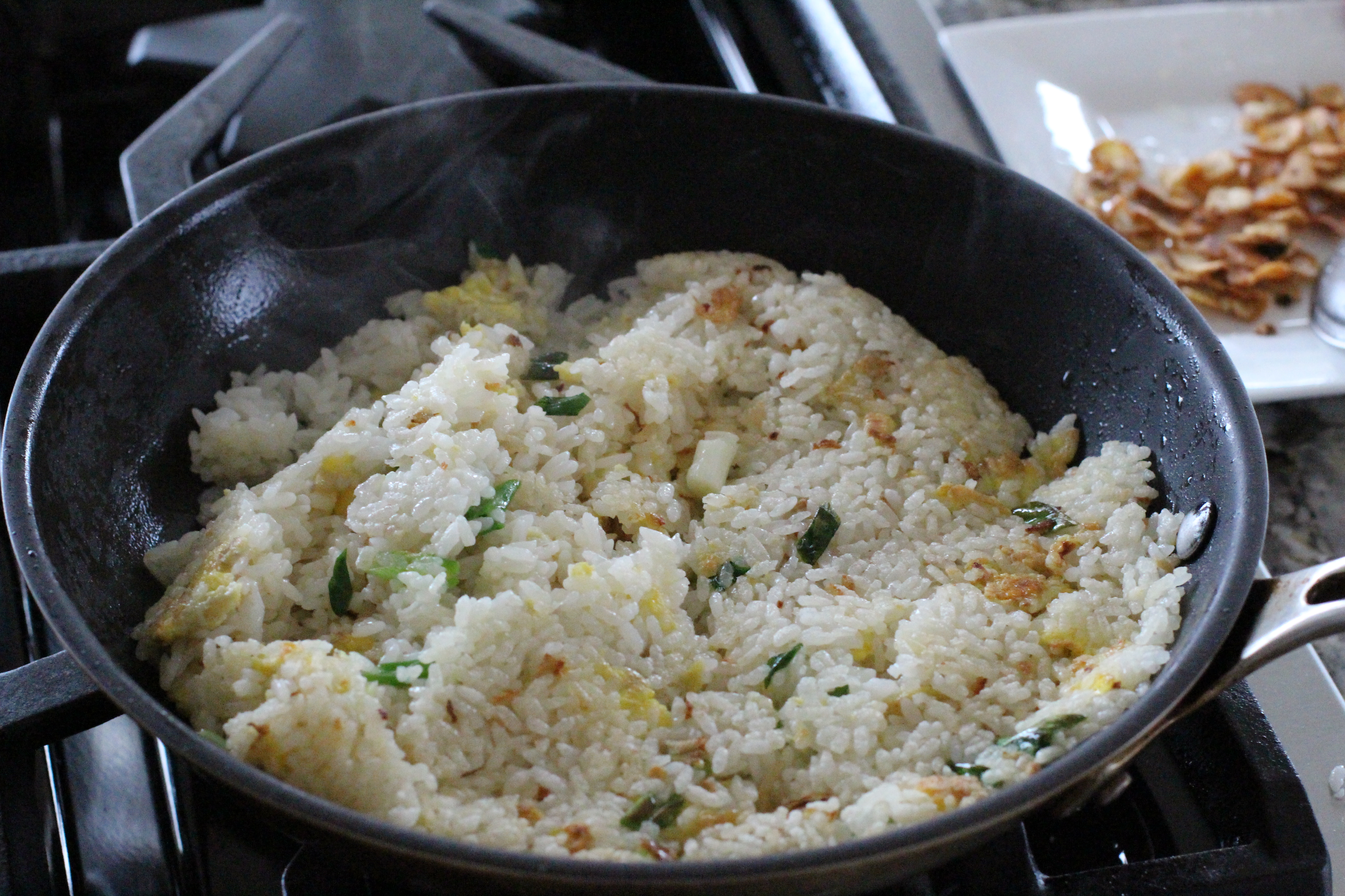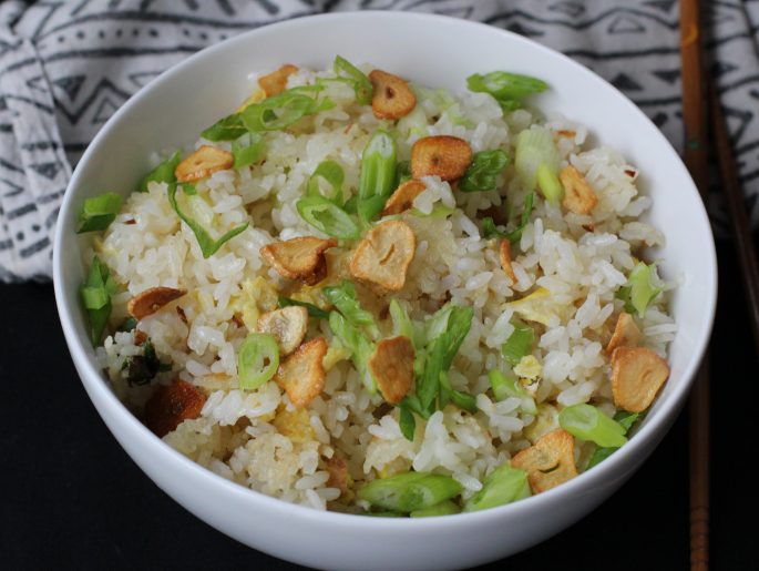 This is for all you garlic lovers out there. Garlic is the star here. The oil used for ‘frying’ the rice is infused by roasting garlic in the oil first, then removing it and using the infused oil to ‘perfume’ the rest of the ingredients.