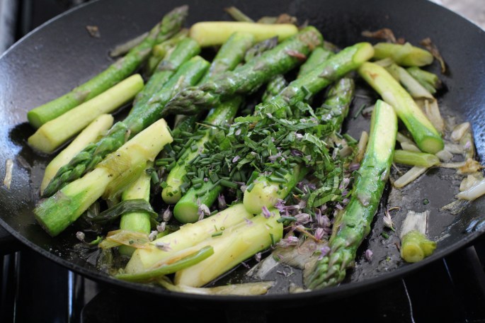 Sautee oil and onions or garlic if using with asparagus until it is just starting to soften and add the stock. When the vegetables are just beginning to look glazed add the herbs. Continue cooking until the asparagus is done to your liking. Serve with a salad or over polenta making sure to scrape up all the herbs and onion clinging to the pan.