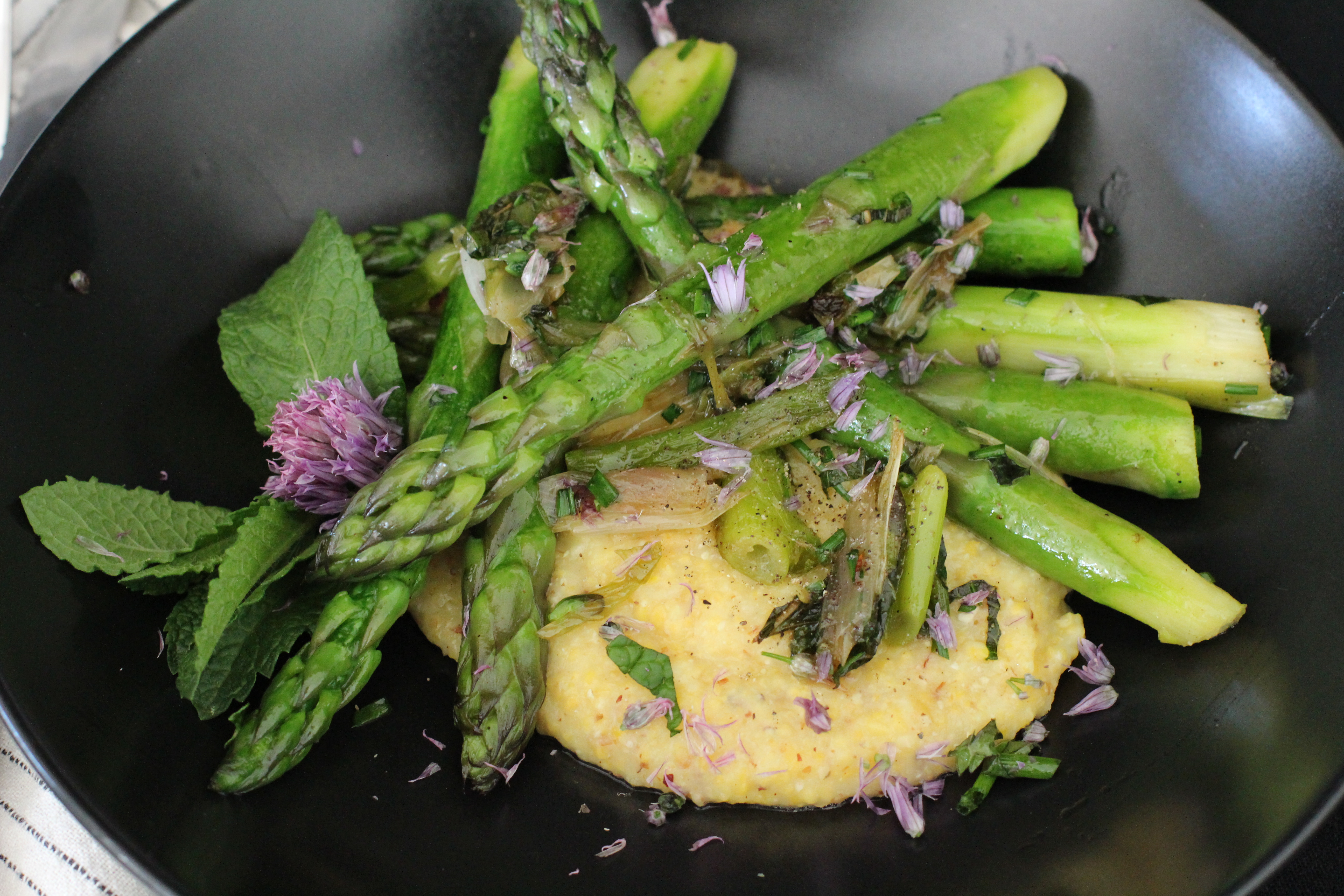 I sauteed my asparagus with walking onions, chive blossoms and some mint (recipe below) – it made enough for two herby asparagus side dishes. The first one, I made some polenta and topped it with the asparagus and herbs.