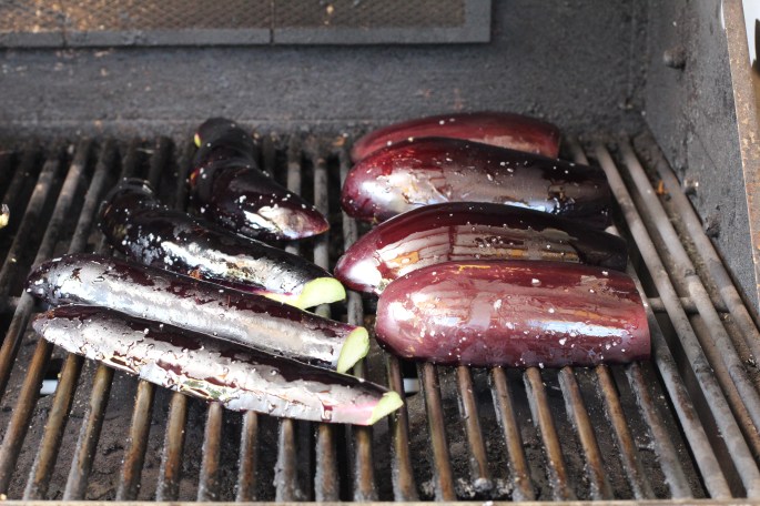 Cut the eggplant in half and rub them with oil and salt and grill them on high for 15 to 30 minutes until they are soft. The time will depend how big your eggplant are. I have both Japanese (left) and Italian (right) eggplant.