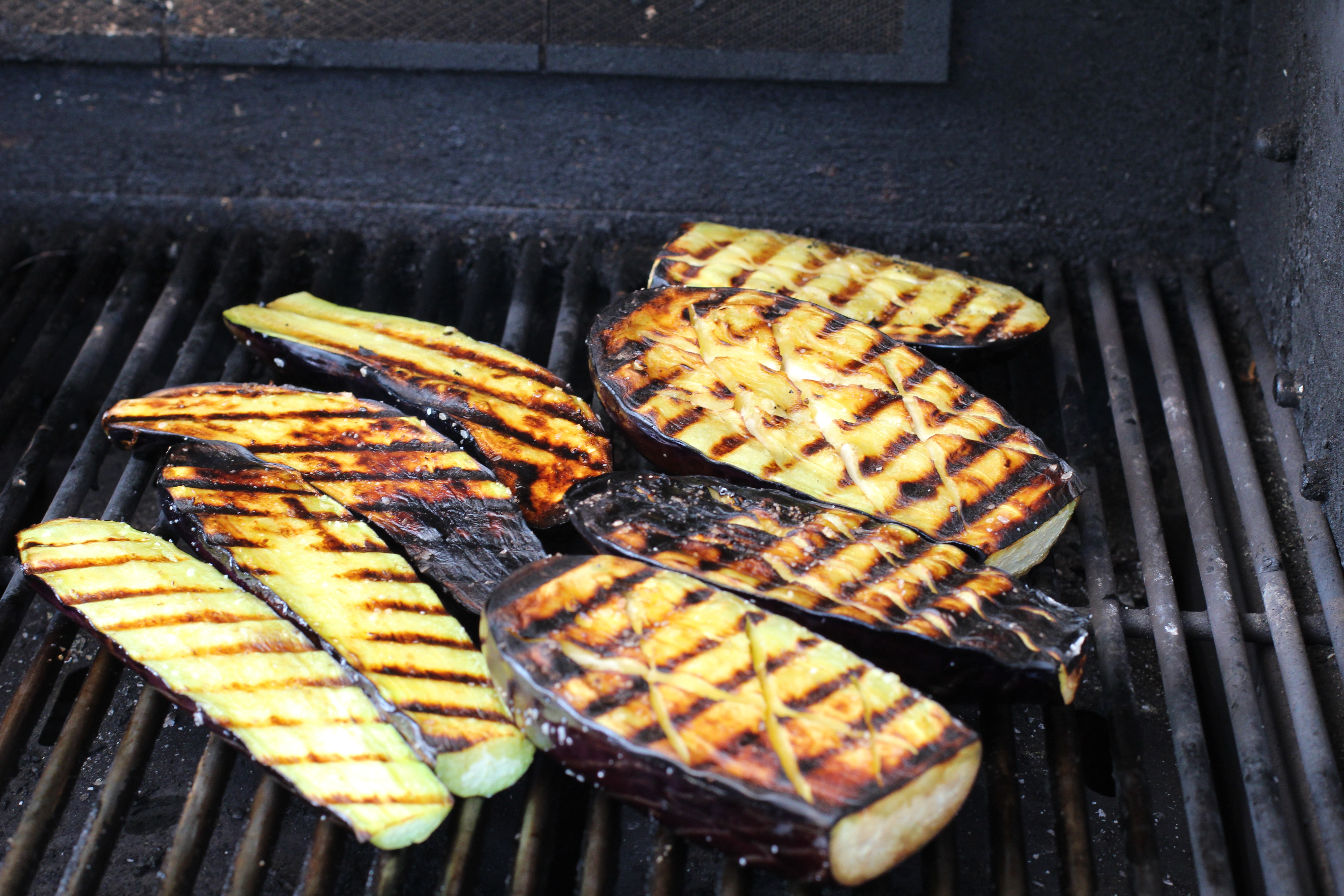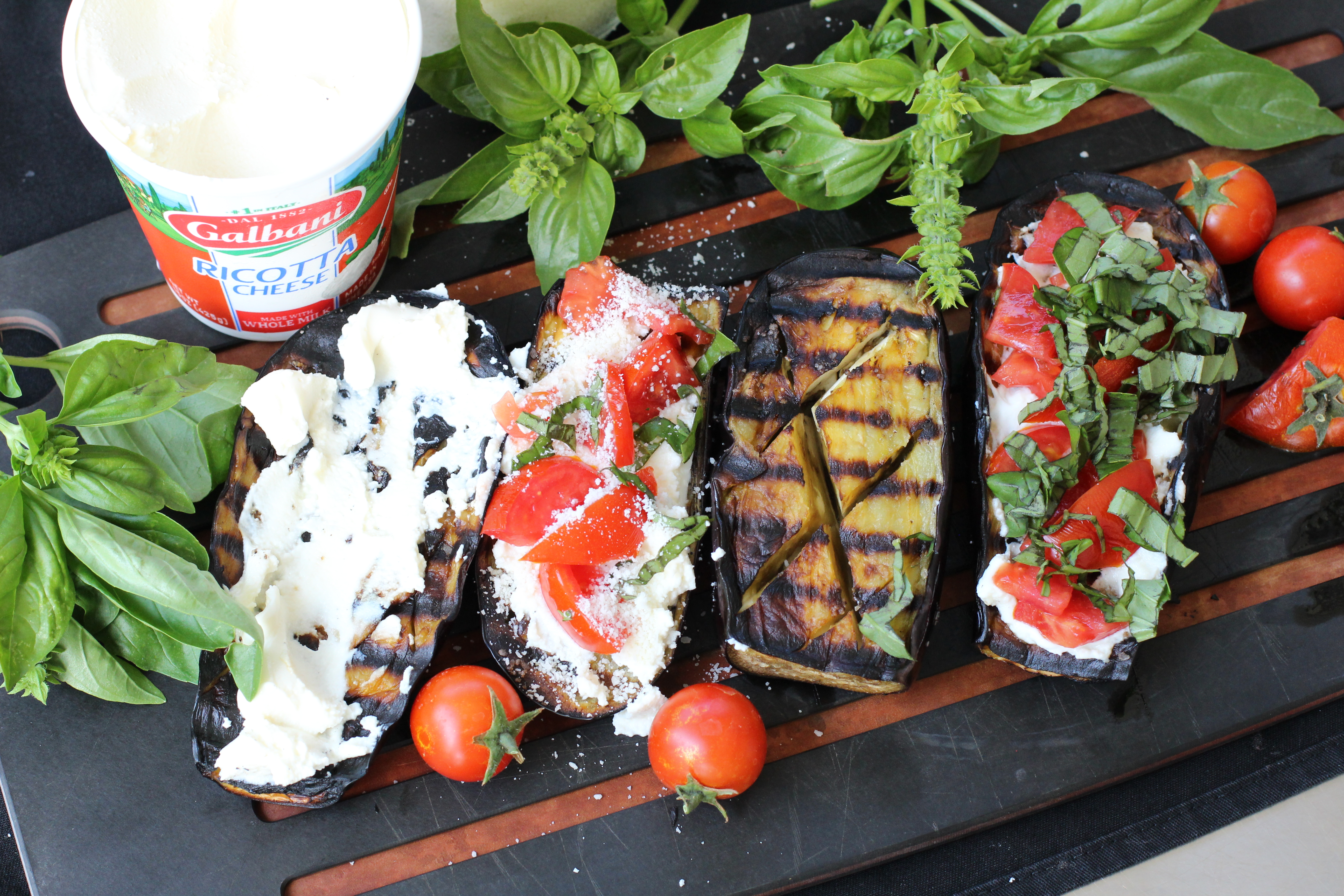 This eggplant dish is gussied up grilled eggplants. You could use zucchini instead of or in addition to eggplant if that is what you have. It’s so hot this week I didn’t want to turn on the oven so I grilled them. You can roast your eggplant in a 400F oven if you don’t have, or want to use a grill. Roast them for the same time as you would grill them.