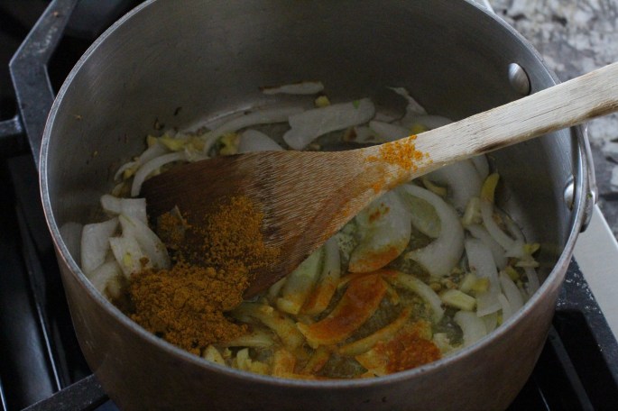 Sauté the onion, garlic and ginger in oil until softened and add the spices and sweetener. I like agave or brown sugar for sweetening. Curry needs heat to ‘bloom’, you will smell spices ‘open up’ and mellow as the dish cooks.