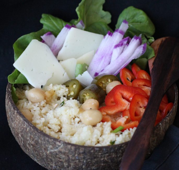 To make it all you do is break off some cauliflower florets and pulse them 8 or 10 times in food processor until it looks like rice. Or you can use a box grater if you don’t feel like busting out the food processor.