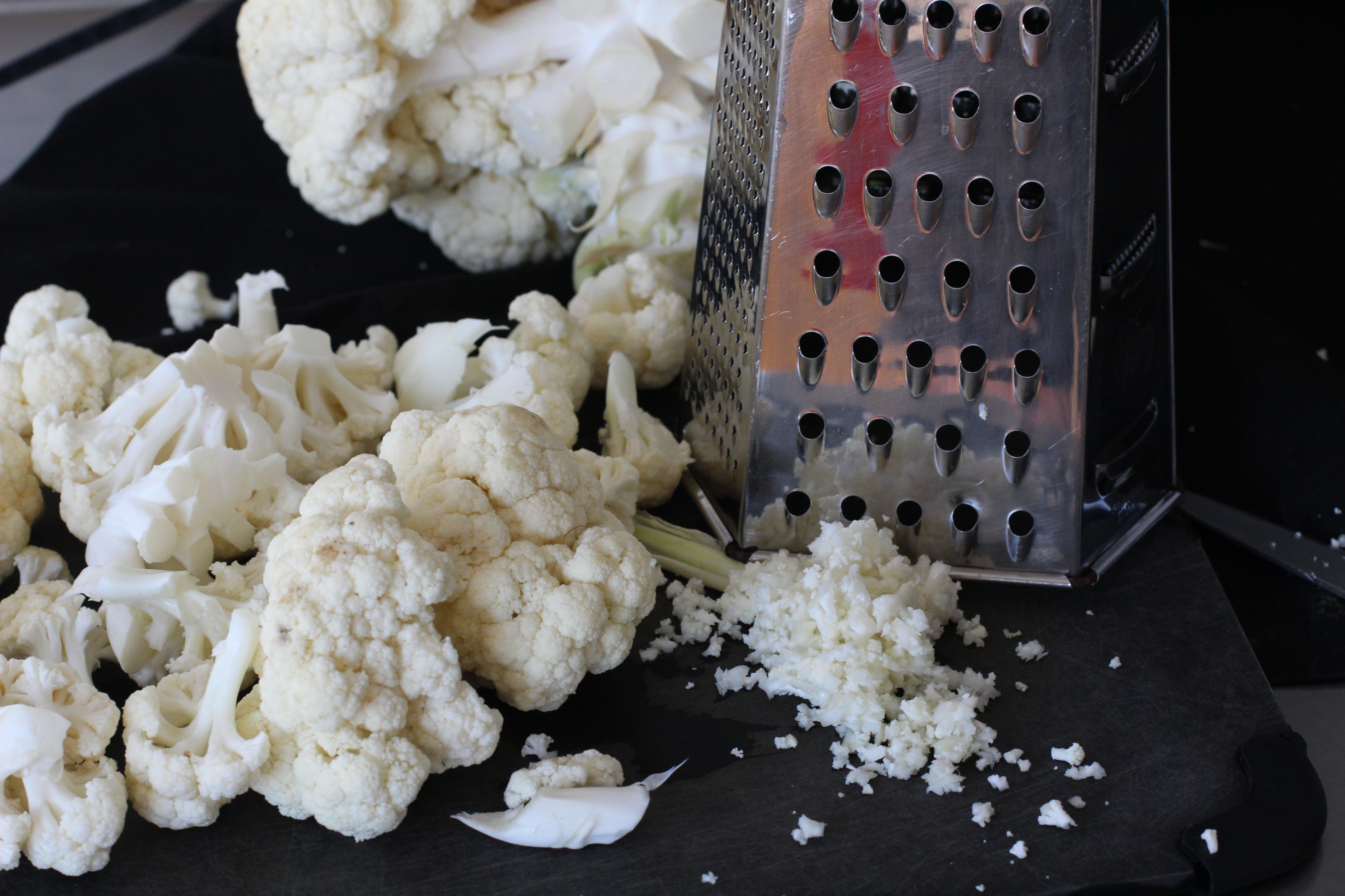 To make it all you do is break off some cauliflower florets and pulse them 8 or 10 times in food processor until it looks like rice. Or you can use a box grater if you don’t feel like busting out the food processor.