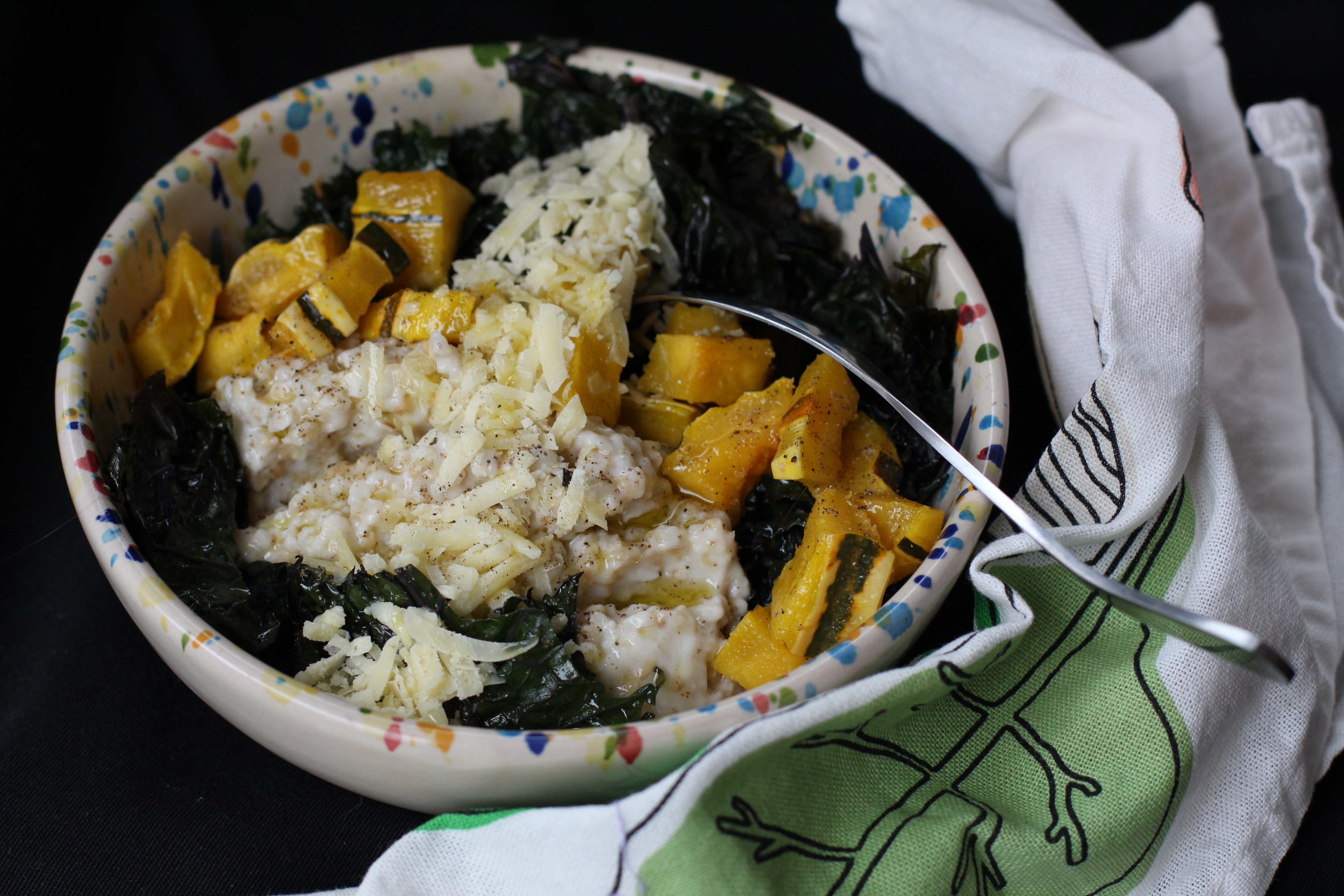 My absolute favorite breakfast and lunch is savory oatmeal. I make enough oatmeal for the week and warm up enough for a meal and add whatever vegetable odds and ends I have. I like to top it with a little olive oil, salt and pepper and cheese. The olive oil and pepper and cheese take oatmeal over the top.