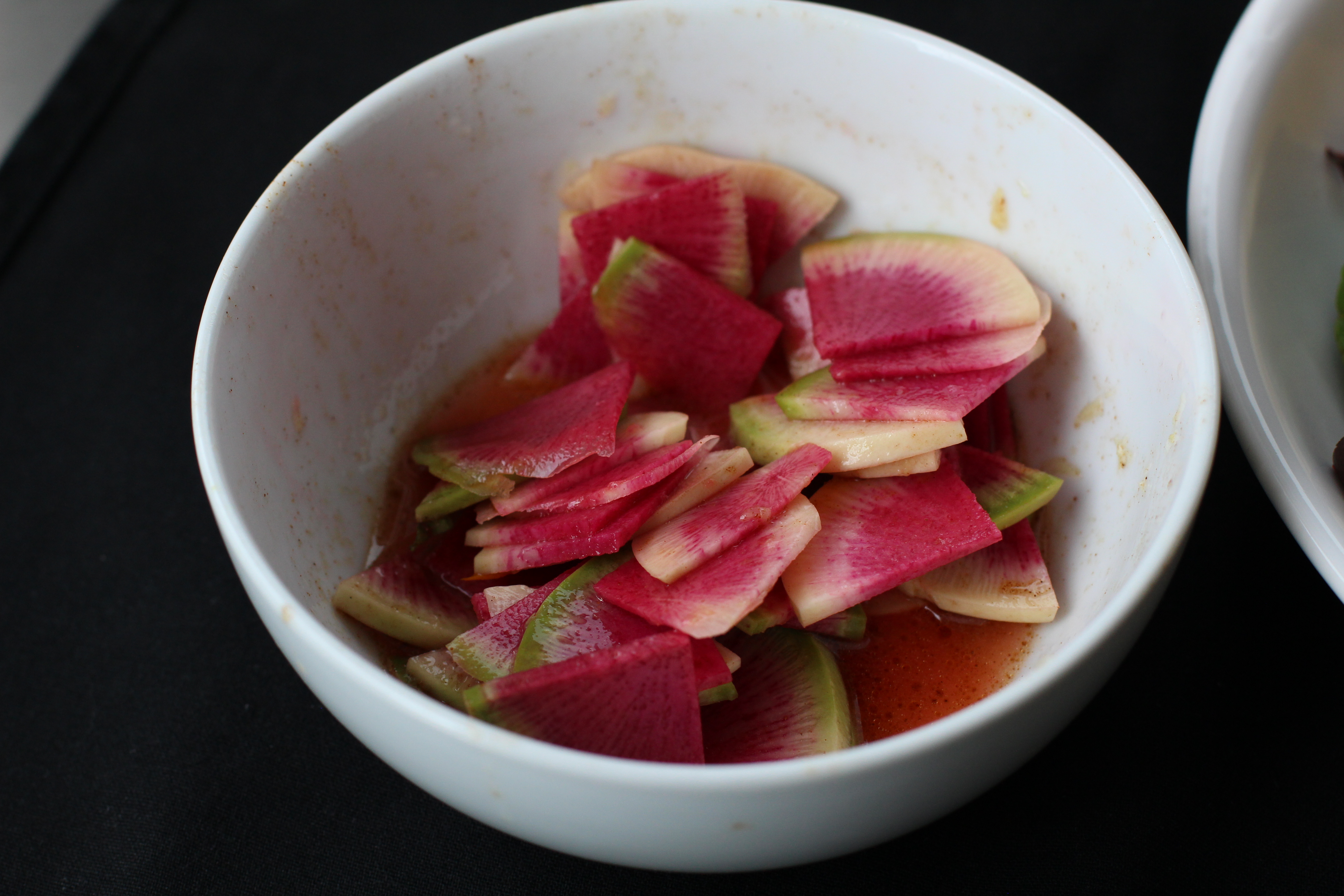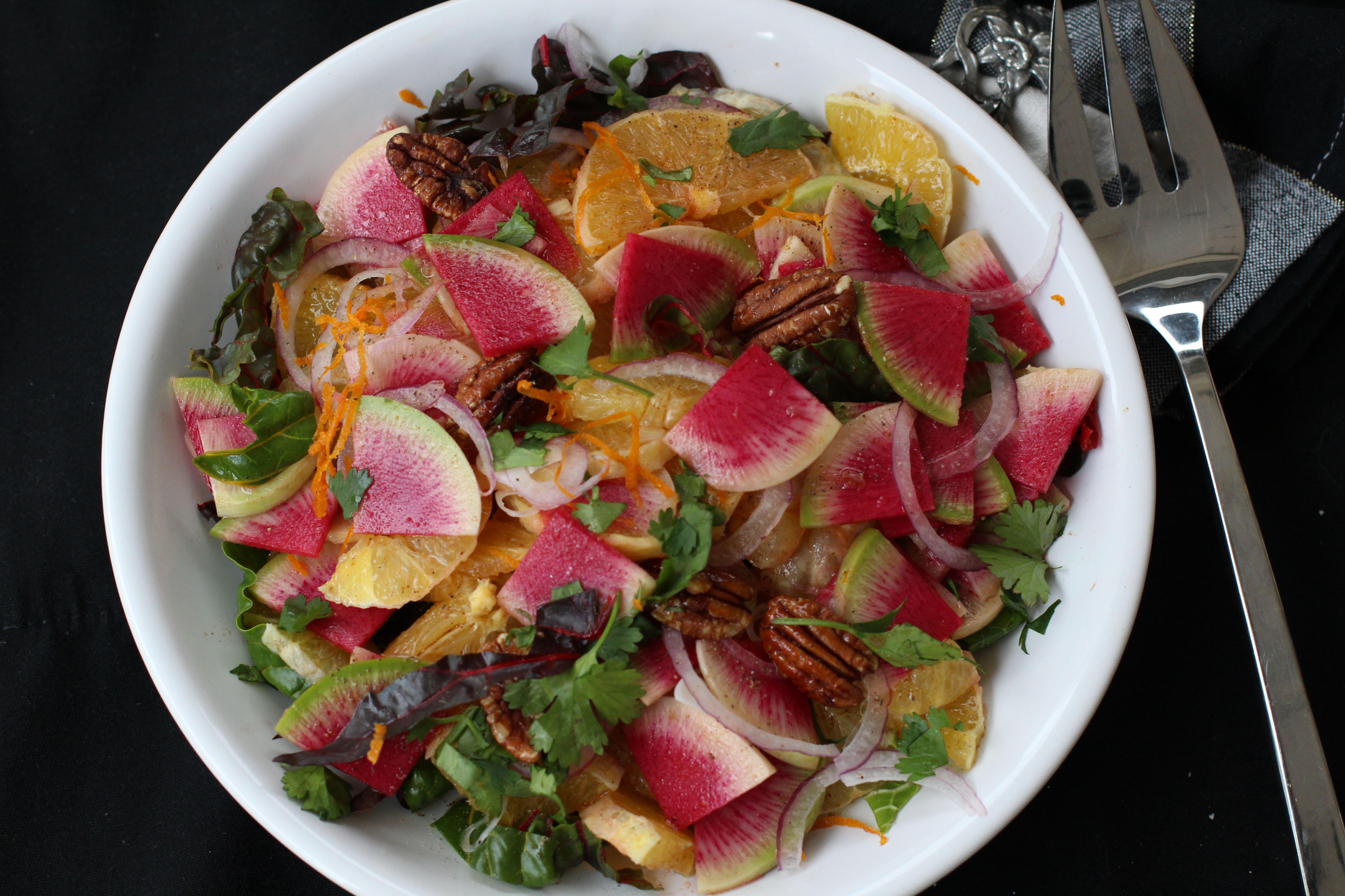 - Peel the citrus and slice it into bite size pieces. Thinly slice the radishes and cut into bite size pieces add the fruit and radishes to the dressing and toss so it is all coated.