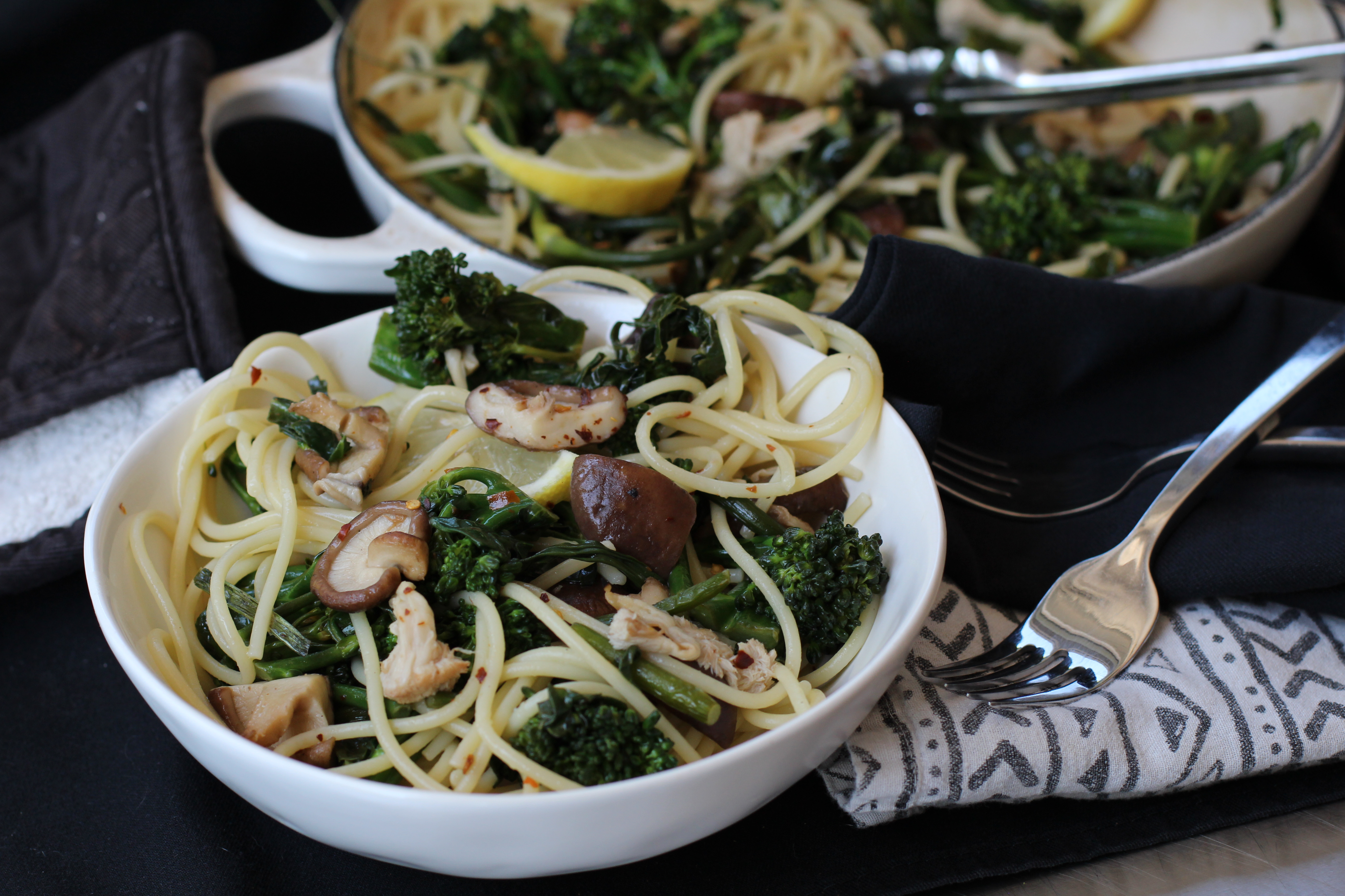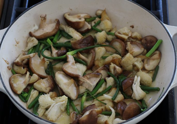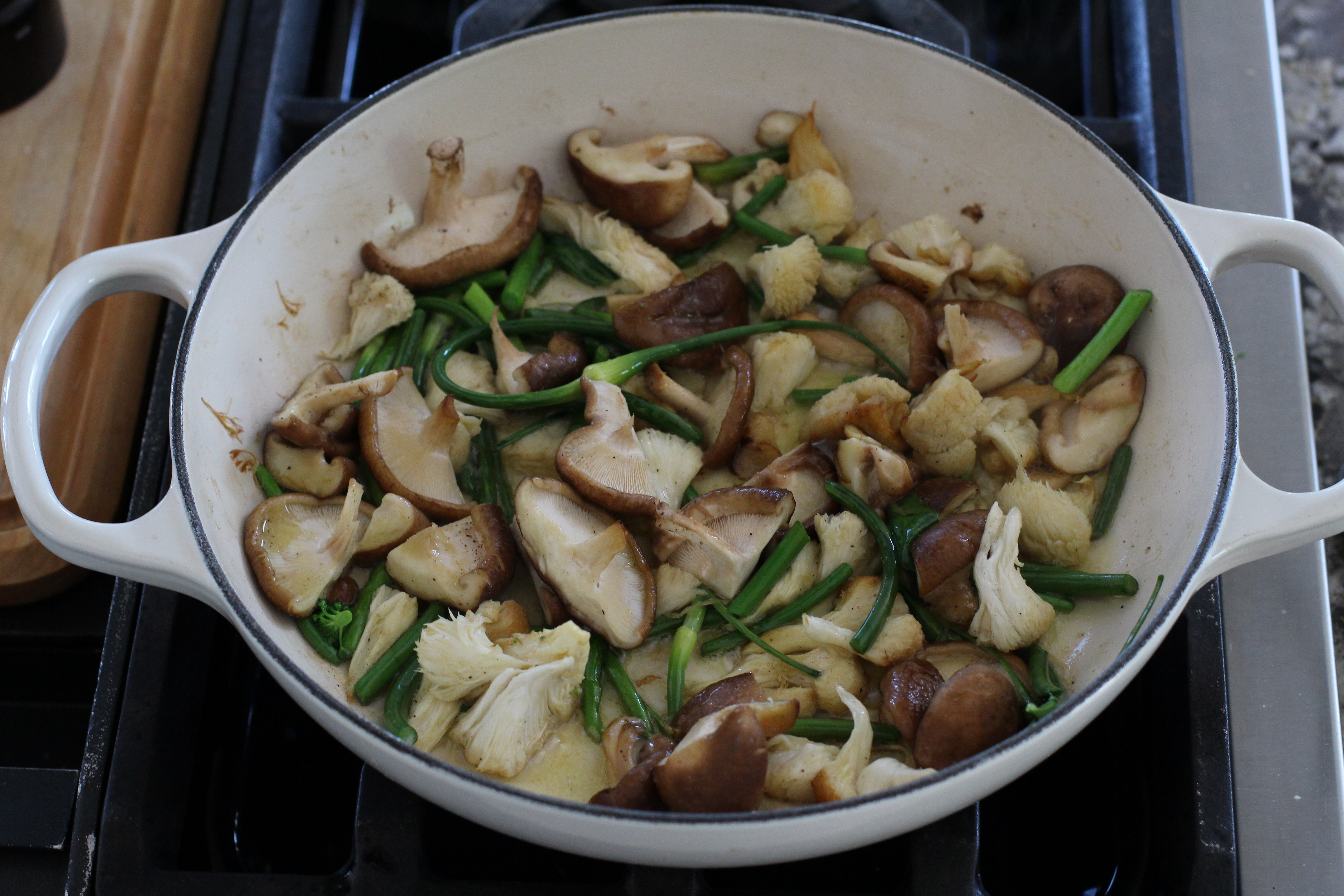This is a vegetarian version of classic shrimp scampi. I used delicious mushrooms from Hazel Dell and sprouting broccoli to stand in for shrimp but stuck with the familiar-wine, butter, garlic sauce. (CSA members can add a mushroom share to their subscriptions.)