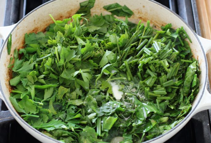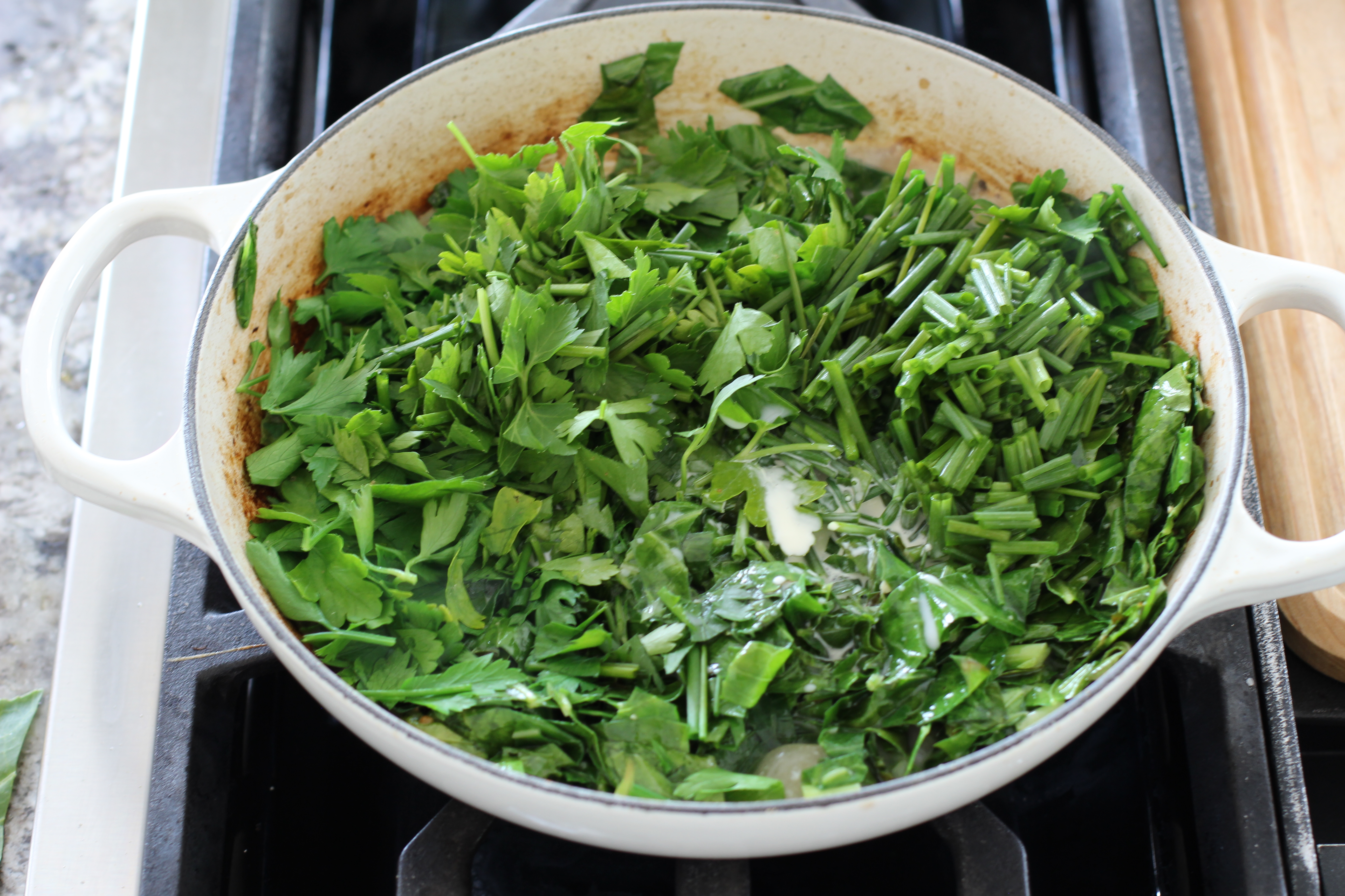 Heat a skillet to medium heat, add the olive oil. Once the oil shimmers, add the onions and garlic and cook, stirring, 1 more minute or so. Add the chopped greens and water or broth and cook that for a few minutes until it wilts.