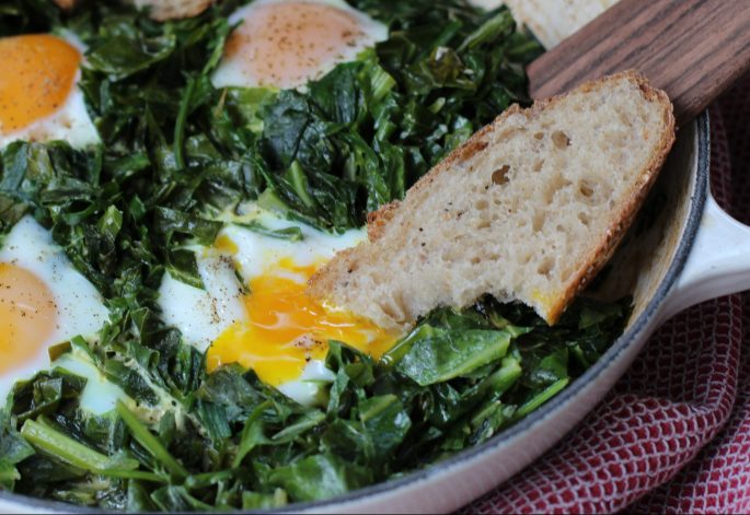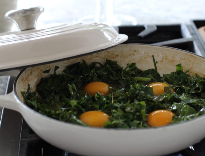 Make some dents in the greens, add the eggs then cover the dish and cook that over a medium heat for about 5 minutes.