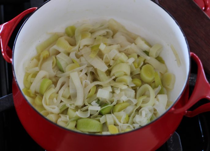 Add the leeks and the rest of the ingredients to a pan and cook on a medium low heat with the lid on for 20-30 minutes.