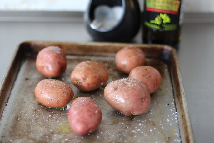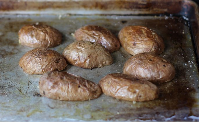 To make your potato skins start by baking washed, oiled and salted potatoes in a 400F oven for 40-60 minutes depending on how big your potatoes are. Stab the potatoes a few times so they don’t blow up. Trust me on this and stab them. Make more than you need if you have lots of potatoes that need using up. These freeze beautifully or keep in the refrigerator for several days for quick meals or snacks.