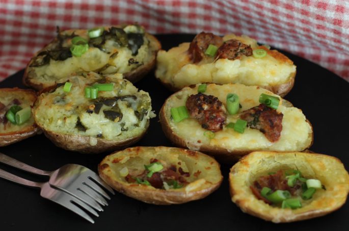 When the potatoes are done baking, let them cool for a few minutes and cut them in half and scoop out the insides. Save the insides for soups or mashed potatoes. If you’re a bread baker like me, use the insides for making bread or rolls. You can also use the mashed potatoes to stuff the skins and make twice baked potatoes. If you look at the top picture I used mashed potatoes and meatballs for some of my skins.