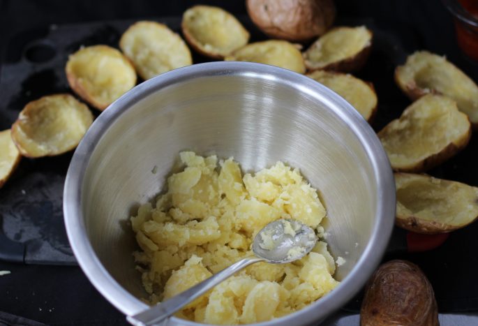 When the potatoes are done baking, let them cool for a few minutes and cut them in half and scoop out the insides. Save the insides for soups or mashed potatoes. If you’re a bread baker like me, use the insides for making bread or rolls. You can also use the mashed potatoes to stuff the skins and make twice baked potatoes. If you look at the top picture I used mashed potatoes and meatballs for some of my skins.
