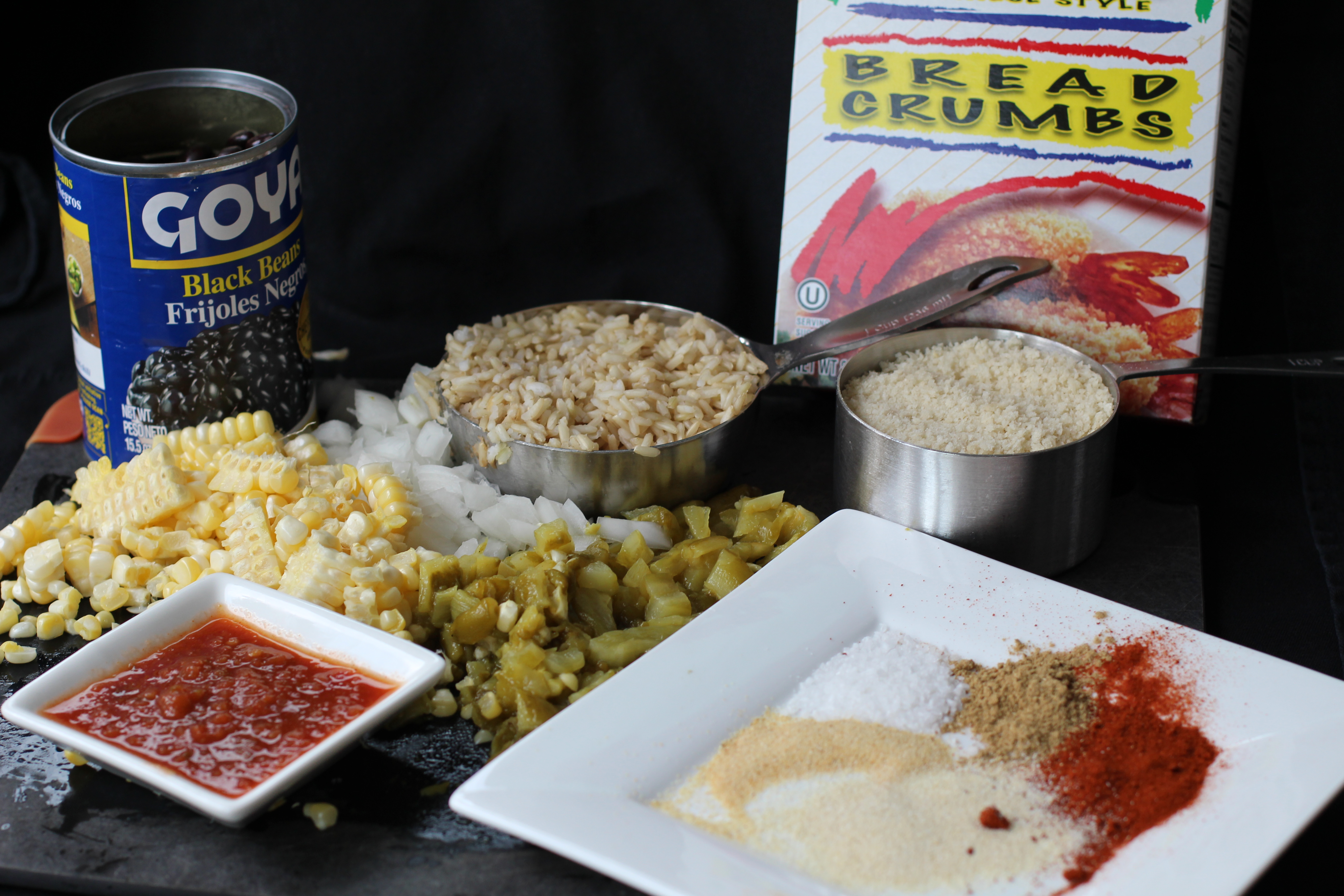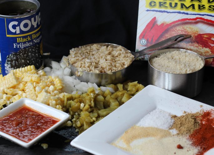Green Chile Black Bean Burger-makes 6 big burgers. This looks like a long list but you probably have everything in your pantry except the corn and chilies.